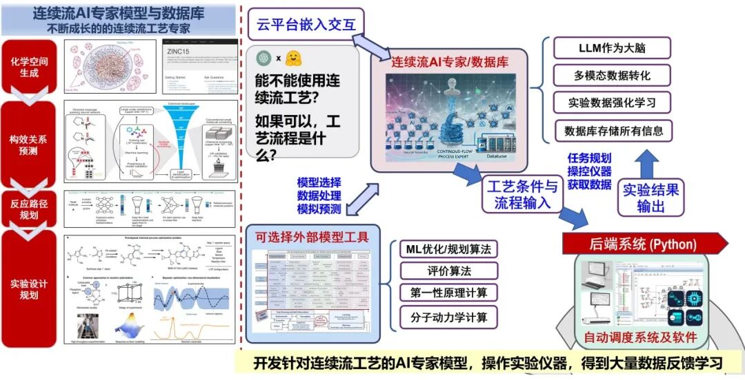 集成机器学习算法,处理数据得到后续实验规划,通过自动化调度系统验证实验。服务端软件由设备控制、自动化流程、数据库、算法四大部分组成,随着实验数据增加,算法和数据库不断优化,提升预测精度和速度,显著加快连续流新技术的创新与推广。