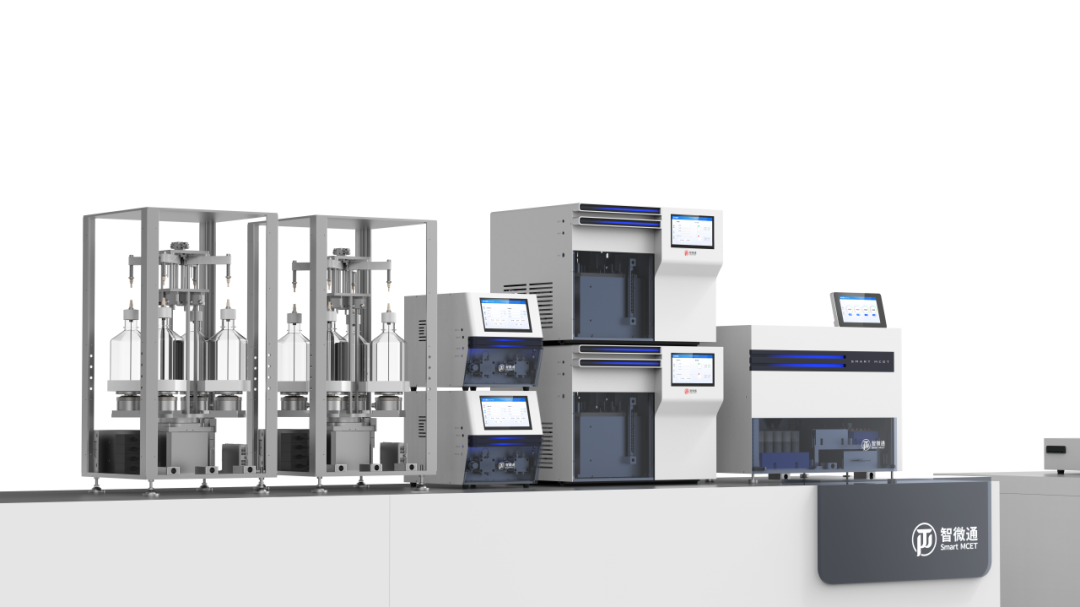 智微通科技自主研发的自动化微反应工作站集群,开发了原料配制、动力、反应、制样、液相色谱检测、控制、机器人等模块(检测模块和机器人与安捷伦、ABB联合开发),采用人机结合的模式,实现实验过程的准确、高效和自主性。