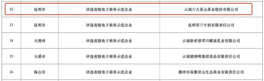 【荣耀时刻】11月18日,云南省2024年电商市场主体载体培育扶持项目评审结果正式揭晓。六大茶山凭借产业链整合能力、显著的示范引领作用以及良好经济和社会效益,获评“省级电子商务示范企业”(省级)称号。