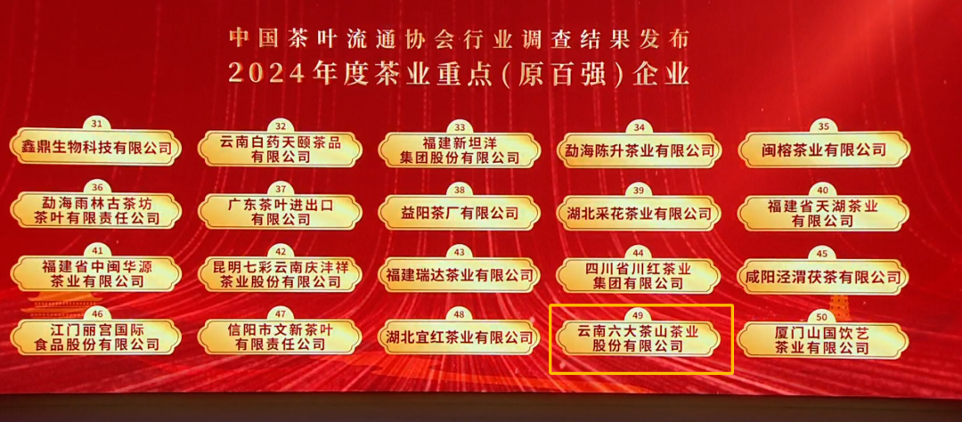 【荣耀时刻】11月29日,六大茶山财务总监出席第二十届中国茶业经济年会,六大茶山入选“2024年度茶业重点(原百强)企业”、2024年度茶业共富发展企业、2024中国茶企业品牌TOP50榜单。此外,六山殿红被评选为2024“中国好红茶”产品与包装五星产品,六大茶山董事长阮殿蓉女士荣获“2024年度茶叶行业优秀企业家”称号。2002年