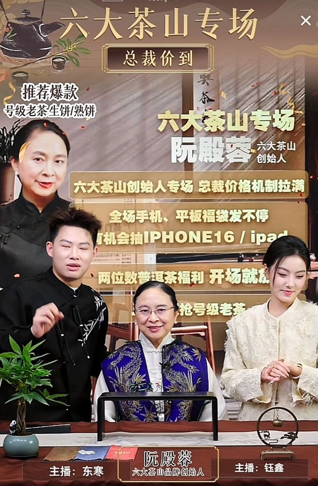 【直播专场】11月13日,六大茶山董事长阮殿蓉女士邀请云南茶叶质量标准“指南针”,中国茶界至高荣誉“觉农勋章奖”获得者苏芳华老先生做客《阮殿蓉会客厅》,这位一生事茶的茶界泰斗,将为我们讲述云茶激荡四十年中的岁月片段。【荣耀时刻】11月15日,六大茶山受邀参加云南省个体私营经济协会第七届会议,晚宴期间,举行了会长单位、副会长单位、理事单位、团体会员单位、会员单位以及退役军人专委会主任委员单位、副主任委员单位、委员单位牌匾颁发仪式。【直播专场】11月16日,六大茶山&交个朋友在抖音开启六大茶山专场,六大茶山董事长阮殿蓉女士、六大茶山品牌运营总监张依梦女士坐镇直播间,为茶友分享六山高品质普洱茶。【品牌动态】11月17日,六大茶山受邀参加明民族茶文化促进会第六次代表大会。大会以“继往开来促云茶,六届茶人再奋进”为主题,不仅是一次茶界精英的汇聚,更是云南茶文化新篇章的起点。