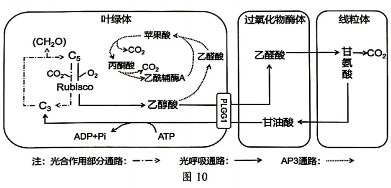 19.(12分)Rubisco酶既可以催化C5的羧化,也可以催化C5的氧化。如果 C5被氧化,则会形成乙醇酸,乙醇酸能抑制暗反应多种酶的活性。为减少该类毒性代谢产物及碳素损失,植物进化出了光呼吸途径,相关路径如图10所示。