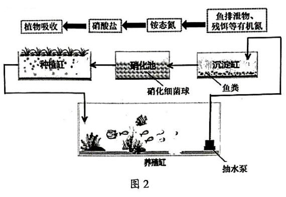 12.新型复合耕作体系-“鱼-菜共生系统”通过完整生态链的构建(见图2),形成“养鱼不换水,种菜不施肥”的种养循环模式,实现了可持续、低碳高效的生态共生效益。下列叙述正确的是
