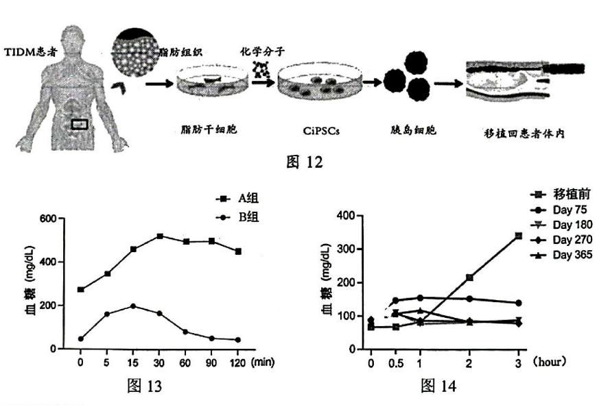 (3)利用CiPSCs制备胰岛细胞后,研究人员将糖尿病模型小鼠分为A、B组,A组进行手术但不移植胰岛细胞,B组体内移植胰岛细胞,然后两组均进行腹腔注射葡萄糖实验,结果如图13所示,该实验的目的是______。经过长时间科学论证后,研究人员将胰岛细胞移植回患者体内,一年内定期进行口服耐糖检测(见图14),结果表明患者能摆脱胰岛素依赖,依据是______。(糖尿病的诊断阀值为血糖水平等于或高于 200mg/dL)。