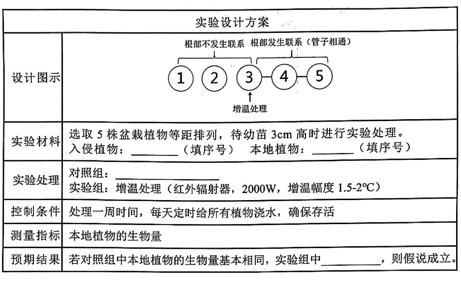 (4)有人认为增温条件下入侵植物根系产生的化学信息可能通过地下传递给邻近植物,从而抑制本地植物的生长,并设计了一个实验来探究这一假说,完成下列表格。