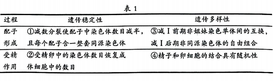 5.某同学对二倍体生物的遗传稳定性和多样性原因进行综合概括(见表1),其中表述有误的是