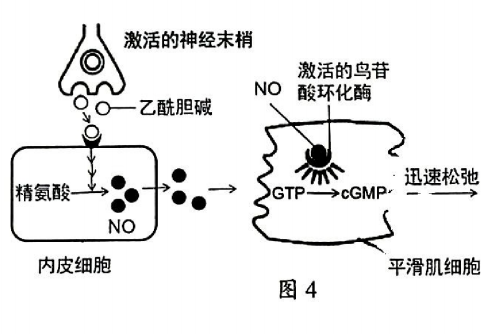 14.内皮细胞对神经末梢传来的兴奋产生反应,释放NO引起血管壁平滑肌细胞松弛,使血管扩张引起血压下降(见图4)。下列分析错误的是
