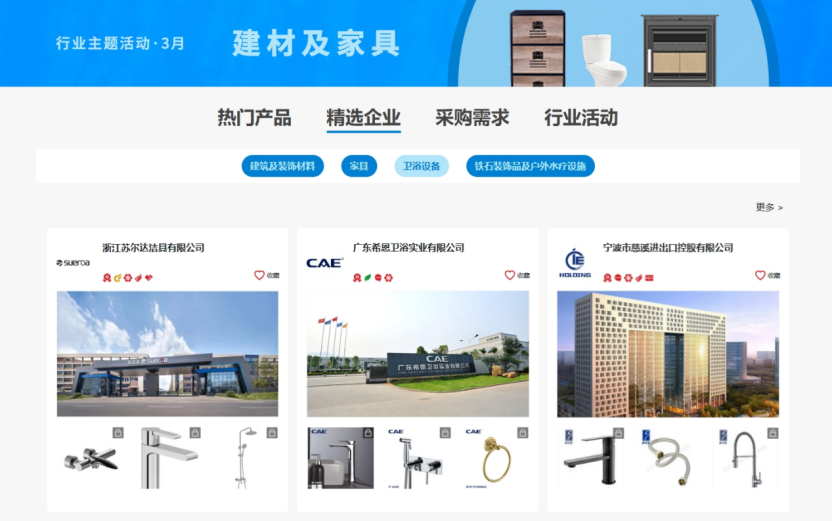 “热门产品”和“精选企业”板块集中展示建筑及装饰材料、卫浴设备、家具、铁石装饰品及户外水疗设施等4个展区约400家优质企业(广交会品牌企业、广交会线上平台B/C套餐企业、广交会设计创新奖获奖企业等)的热门产品,助力企业及产品提升曝光度。