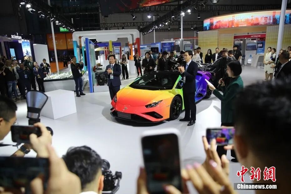 11月5日,第七届中国国际进口博览会在国家会展中心(上海)开幕,技术装备展区聚焦科技、工业、环保三大主题,集中展示了数字工业自动化、能源低碳及环保技术、集成电路、人工智能、新材料等全球高端装备和前沿技术。图为兰博基尼艺术车在进博会上首发。