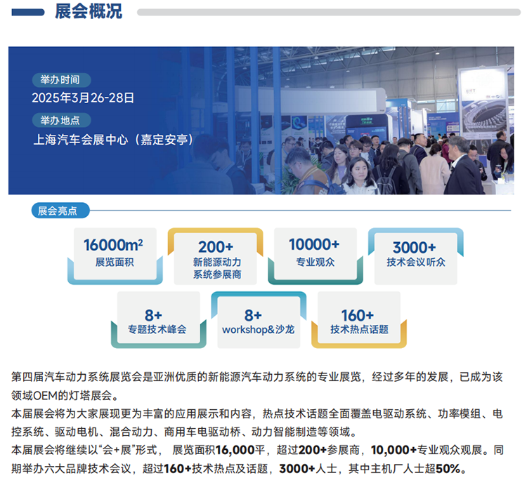 APTE2025上海汽车动力展将为大家展现更为丰富的应用展示和内容,热点技术话题全面覆盖电驱动系统、功率模组、电控系统、驱动电机、混合动力、商用车电驱动桥、动力智能制造等领域。本届展会将继续以“会+展”形式, 展览面积16,000平,超过200+参展商,10,000+专业观众观展。同期举办六大品牌技术会议,超过160+技术热点及话题,3000+人士,其中主机厂人士超50%。