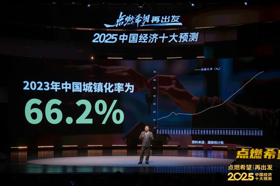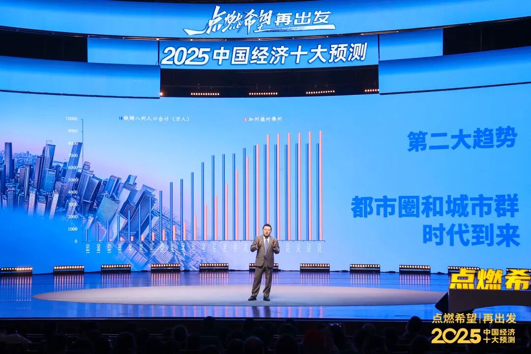 来源:泽平宏观(ID:zepinghongguan)尊敬的各位来宾,女士们,先生们,大家好!我是任泽平!今天,我演讲的题目是:点燃希望·再出发——2025中国经济十大预测。为什么再出发?因为时代变了,我们需要看到变化,顺势而为,重新出发。为了今天的这场演讲,我调研了上百家企业,看了几十本书,希望对你看清时代的趋势、把握未来的机遇有帮助。在这里,我要感谢深圳人才集团、深圳广播电影电视集团、洋河梦之蓝·手工班等合作伙伴对本次活动的大力支持!2024年即将过去,展望2025,未来将有哪些新趋势?发生什么大事件?诞生哪些新机遇?让我们一起点燃希望,勇敢出发!这是一个新周期、新时代,顺应新趋势,把握新机遇,勇敢再出发,一切发生皆有利于我这两年,我们组建了泽平宏观实战游学,看了很多前沿科技和标杆企业,读万卷书,行万里路,很多同学说很有意思。我给我们的游学写了三句slogan:第一句,正心正念,坚持做长期正确的事,最终就会开花结果。第二句,悲观者正确,乐观者前行,世界终将属于长期乐观主义者第三句,团队比平台重要,同行的人和沿途的风景,比要去的远方重要。大家经常说,唯有长期主义才能穿越周期,在这里,我要把这句话改成:“唯有长期乐观主义才能穿越周期”,不仅要长期主义精神,更要有乐观主义精神。为什么要乐观?因为,开心乐观就是生命的意义,结果虽然重要,但是如果过程不开心,结果再好也毫无意义。所以,我希望今天这场演讲能达到两个目的,一是讲些干货,能帮大家解决现实问题,二是年底给大家打打气,让我们振奋精神迎接新的一年!朋友们,我们这个时代,不仅是变化,堪称巨变。百年未有之大变局,旧秩序开始瓦解,逆全球化、民粹主义、地缘冲突、国际秩序调整等现象涌现。新秩序正在重建,站在新周期的起点上,全球经济社会的低谷往往酝酿科技创新、商业模式、经济制度和产业浪潮的新一轮革命。以人工智能和新能源为代表的第四次科技革命如火如荼,企业千帆竞发出海全球,中国拉开大规模刺激经济的序幕,新质生产力被寄予厚望。在准备这次年度演讲前,我跟几十位企业家进行了交流,现在企业家的基本画像是三点:一是大家这两年对当下内外部形势认识已经比较清醒,这跟前几年有很大不同。比如,前些年还有人幻想外部的贸易摩擦能够很快结束,经济还能重回高增长时代,房价还有可能大涨,这两年企业家基本都清醒了。二是大部分企业家其实并没有躺平,大家还在努力的奋斗,积极的折腾。三是面对新常态,大家都在求新求变。比如,寻找新市场,出海;寻找新赛道,新能源、低空经济、银发经济;寻找新工具,大家都在关注人工智能。这是很大的变化,大家对旧时代不再留恋,开始开启新时代的大门,都在寻找新趋势、新机遇。百年未有之大变局,也是百年未有之大机遇。像马斯克、张一鸣、雷军、王传福等这些新一代领军企业家,顺势而为,抓住了时代的机遇。赢在大势,才能赢在未来。在这个巨变的时代,比勤奋更重要的是顺势而为。为什么?打个比方,大家都是跑步,你在正确的方向上跑步,就好像在高铁上跑步一样,自带300公里时速。300公里时速是什么?就是时代给你的机会。要么乘上时代的列车,要么被时代的列车抛下。当我们看看富豪榜、企业榜起起落落的时候,明显感受到时代变迁,对亿万人命运的改变。这些改变,对个体是偶然,对群体是必然。变才是最大的不变。
