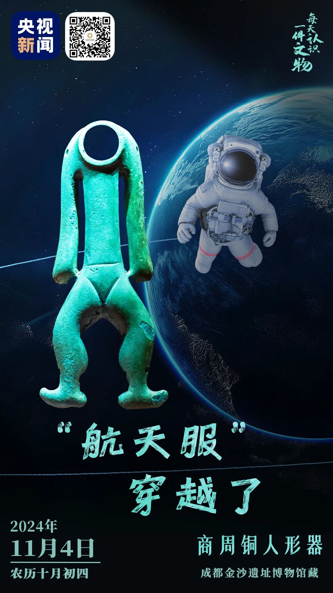 央视新闻联合全国博物馆推出文博科普产品《文博日历》,每天带你认识一件文物。“撞脸”航天服、又像“开瓶器”的商周铜人形器出土于金沙遗址。其上肢自然下垂,下肢微蹲,双足外展,脖子和小腿外侧各有两处四个对称的小孔。学者猜测,它是某类大型器物上的装饰挂件,供古蜀王国的巫师作法时使⽤。长按识别图中二维码查看详情↓