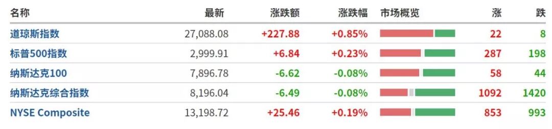 标普500指数也创下历史收盘新高,上涨0.2%,收于2999.91点,纳斯达克综合指数下跌0.1%,至8196.04点。