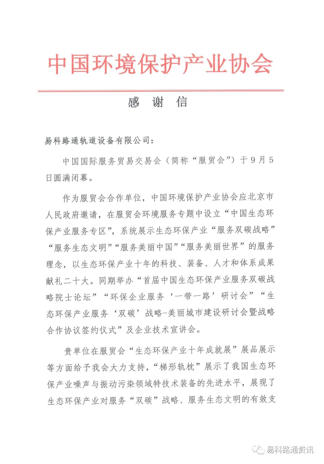 我司在“生态环保产业十年成就展”展品展示了我司绿色减振降噪主打产品——梯形轨枕。“梯形轨枕”展示了我国生态环保产业噪声与振动污染领域特技术装备的先进水平,体现了我国生态环保产业服务美丽中国建设、建设美丽世界的使命和担当,得到了北京市政府、生态环境部、各地政府部门、专业观众和媒体的高度评价。中国环境保护产业协会特回函致谢我司。我司将不辱使命,继续为噪声与振动污染防治环保产业做出贡献!