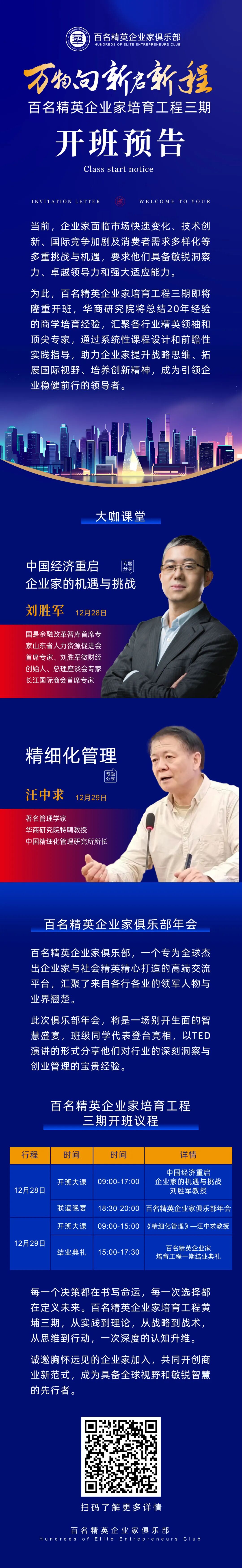 百名精英企业家培育工程黄埔三期课程,将持续为企业家提供高端学习平台,涵盖企业参访、投资考察、名师授课等多维度成长体系。期待与您一起,在新时代的浪潮中,把握机遇,实现跨越式发展!