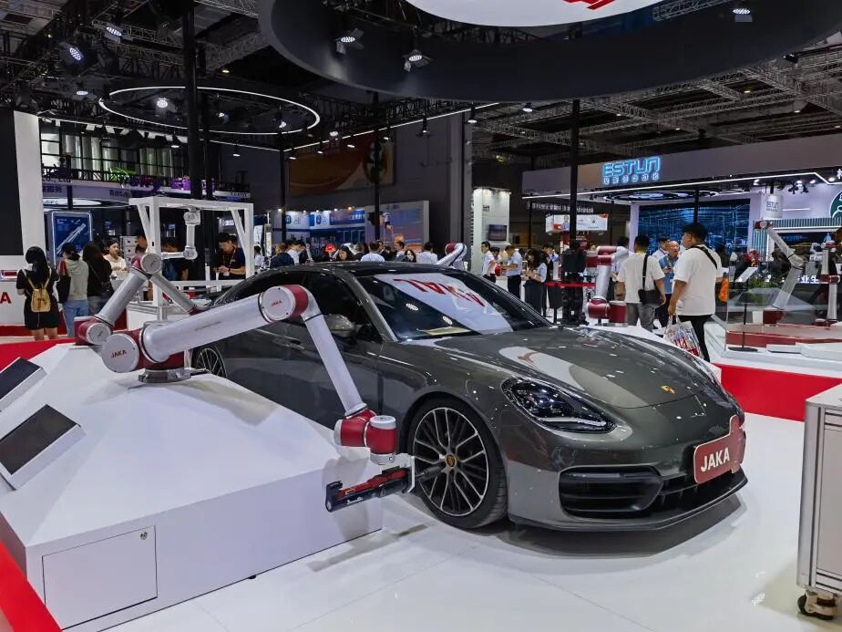 其中,智能车灯检测工作站将JAKA A 5X视觉相机与运动控制一体化相结合,实现了手眼脑融合的智慧检测,有效杜绝了错检、漏检现象。而智能喷涂机器人JAKA Pro 12则凭借IP68防护等级和先进算法,精准模拟人工喷涂技巧,轻松适应多种涂环境,为车身喷涂提供了高品质的解决方案。此外,节卡还展示了车身及车门的面差间隙检测系统、车把手拉力探查机器人、轮毂拧紧工站以及挡风玻璃涂胶机器人等一系列创新产品。