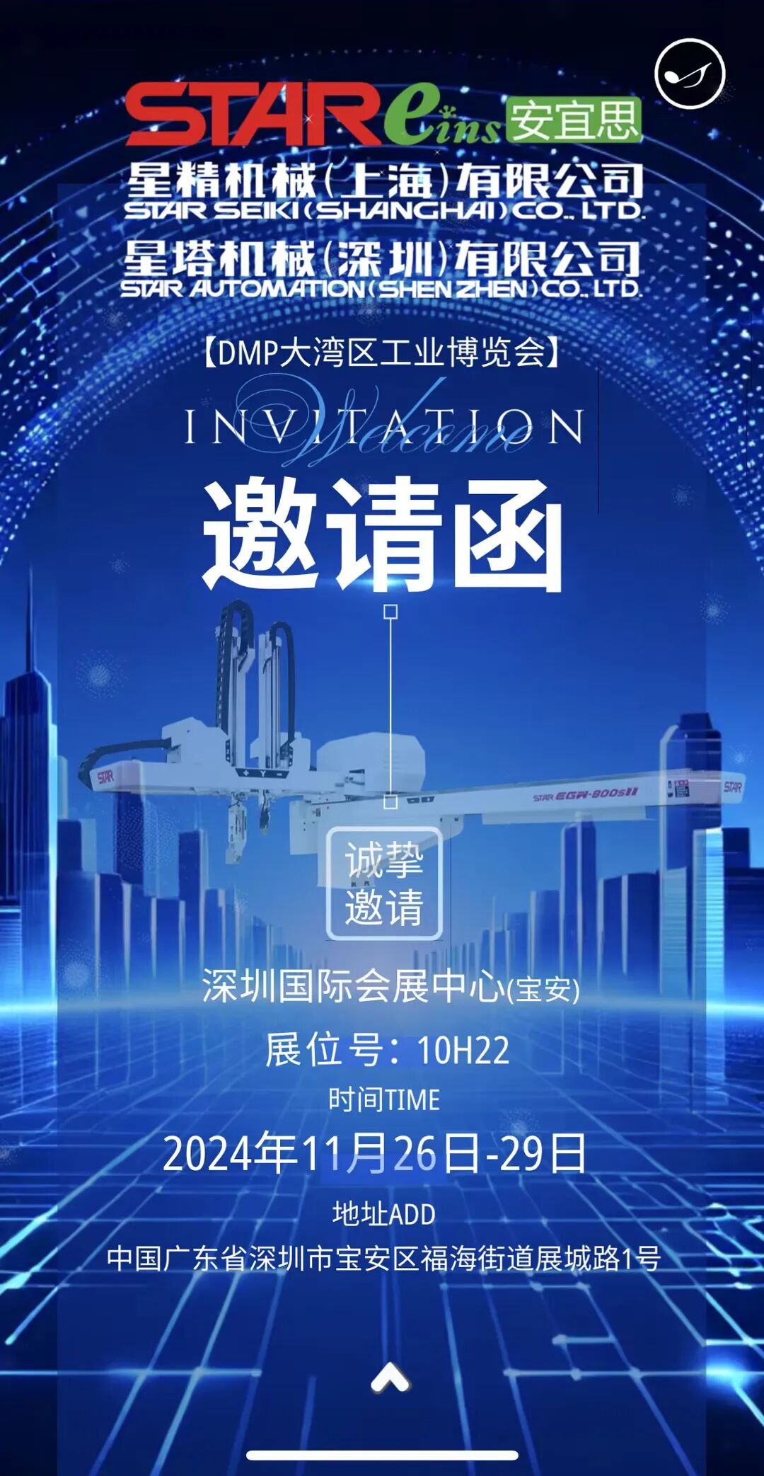 展会名称:2024 大湾区工业博览会展会日期:2024年11月26日~29日展会时间:9:30-17:00(最后一天截止时间14:00)STAR展品:STAR机械手协展;物流装箱码垛机&eins安宜思夹具部品