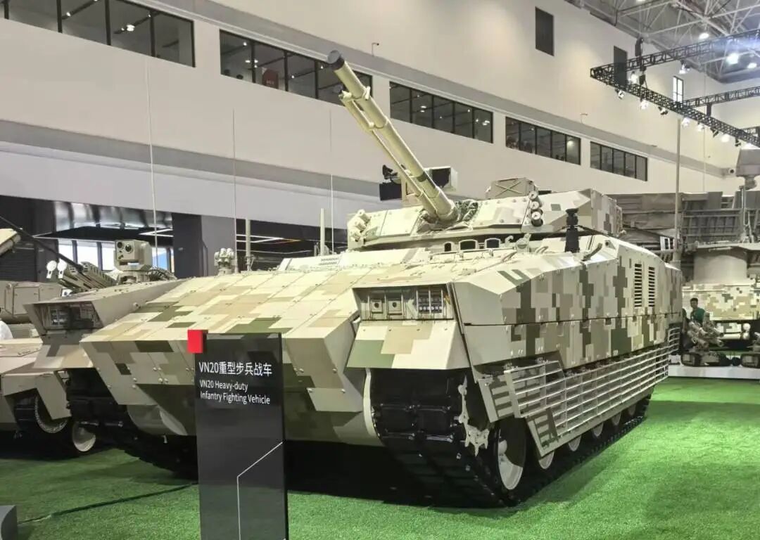 说回装备本身,此次航展上最重磅的有人履带式车辆毫无疑问是以全新技术形态亮相的VN-20重型步兵战车。相比起上次航展那辆看起来随便找了个武器站扣上去的原型车,此次亮相的VN-20使用了中东大户最喜欢的“瓜园”系列武器站的国产衍生型,使用了经典的100mm低压线膛炮+30mm 2A72机炮双火力配置,此外为了弥补100mm炮射导弹穿深不足的问题在炮塔两侧加装了一共四颗大概率为红箭-12类似物的射后不管非瞄准线式反坦克导弹,极大强化了该车的反装甲能力。辅助火力方面,为了充分利用“瓜园”那并不充裕的空间,遥控武器站集成到了车长周视镜基座上,和T-90M颇有几分相似。为了防止单兵绕侧偷袭的小人,VN20在车体后方还额外加装了两座遥控武器站,使得该车的整体火力水平真正达到了丧心病狂的地步。其他方面,虽说车体还是那个熟悉的VT-4车体,但此次亮相的VN-20相比上个版本进行了进一步修型,去掉了此前车体右侧那个难看的突起,抬高了大灯位置并且在乘员舱开始处设计了一个阶梯状抬高以更好地放置驾驶员观瞄设备,在好看了很多的同时对于防护性能也有帮助。辅助设备方面,此次航展上出现的几乎所有车辆都拥有自带的旋翼无人机和周视摄像头,而VN-20也不例外。总的来说,VN-20可以说是当今地球上三大指标最为爆表的步兵战车,就连T-15和BMPT这种怪物都不一定比得上,在证明我国实力的同时也展现了中东大户的合理需求,绝对是一款明星产品。