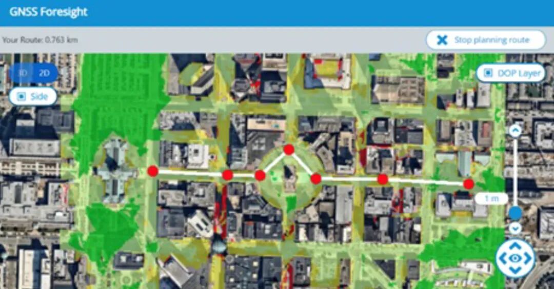 GNSS Foresight(远见)利用高清3D地图和卫星精密轨道模型对每颗GNSS卫星在每平方米、每英尺高度、每秒的视线和非视线波束进行投射/追踪,并以极高的精度计算每颗卫星被建筑物或其它障碍物遮挡的时间和地点,精确地预测GNSS卫星的可用性和相关联的定位性能,为用户提供风险分析报告或当前至未来三天的逐秒预报服务,并支持通过API对预报数据进行访问,用于预先或实时路径规划。