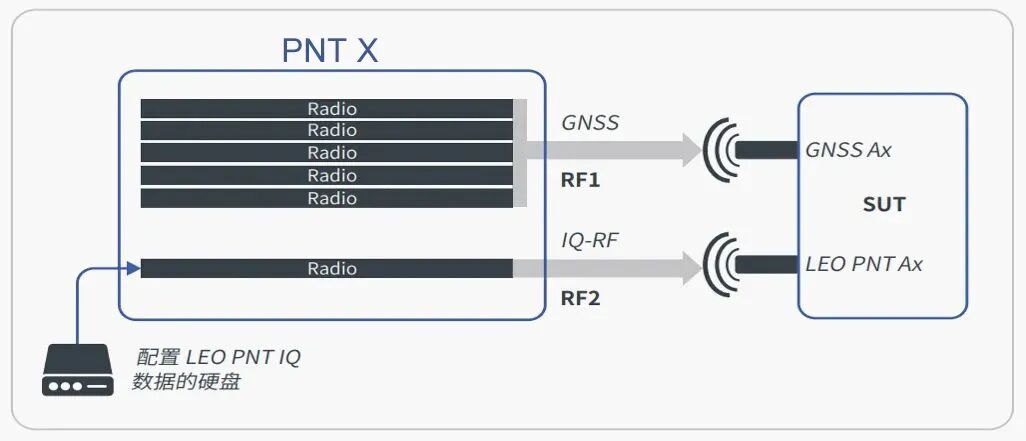 RF1输出现有星座/频点的GNSS信号 RF2输出与GNSS协调一致的LEO PNT信号 将这些信号都输出到兼容的被测设备,客户可以评估和优化传感器融合算法,并全面确定可靠保持时间等关键指标