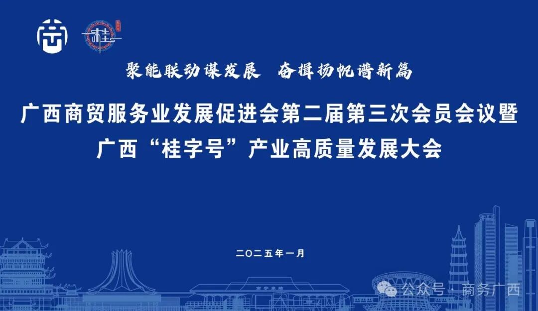 2025年1月19日,由广西壮族自治区商务厅指导,广西商贸服务业发展促进会主办的广西商贸服务业发展促进会第二届第三次会员会议暨广西“桂字号”产业高质量发展大会在南宁隆重举行。大会以“聚能联动谋发展,奋楫扬帆谱新篇”为主题,旨在推动广西“桂字号”产业向更高层次、更深程度、更高质量发展,进一步提升广西“桂字号”企业的品牌形象和市场竞争力,为“桂品出乡”“桂品出海”行动提质扩容赋能。