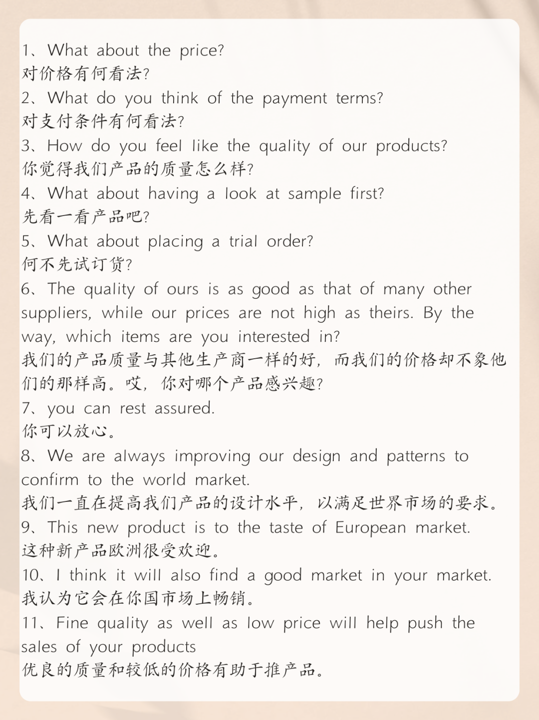1、广交会上,很多人因口语口音不标准而羞于表达,其实不必如此。大部分人的外语口语都不标准,大胆开口就好。谈及价格、交货期、产品特性时,要语气坚定、表达专业,让客户放心将订单交给你(前提是真懂产品,而非忽悠)。
