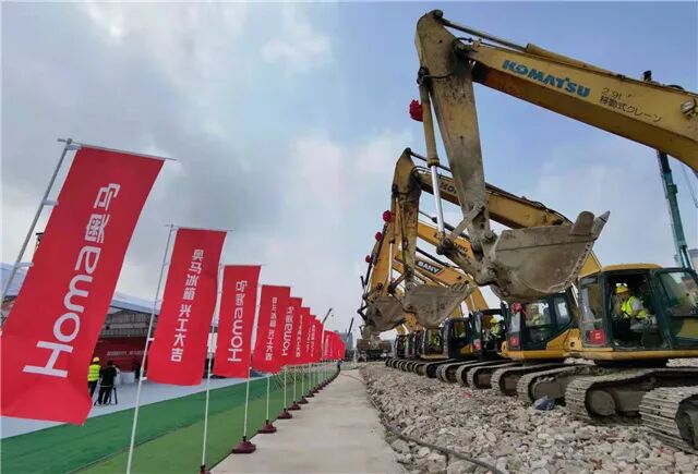 开工仪式现场彩旗飘飘,十多台挖土机一字排开,一派热火朝天的景象。空旷的土地上已堆积了钢筋、水泥等不少施工材料,周围住宅高楼林立,衬托出奥马新制造基地的新未来,为参加动工仪式的嘉宾勾画出宏伟蓝图。