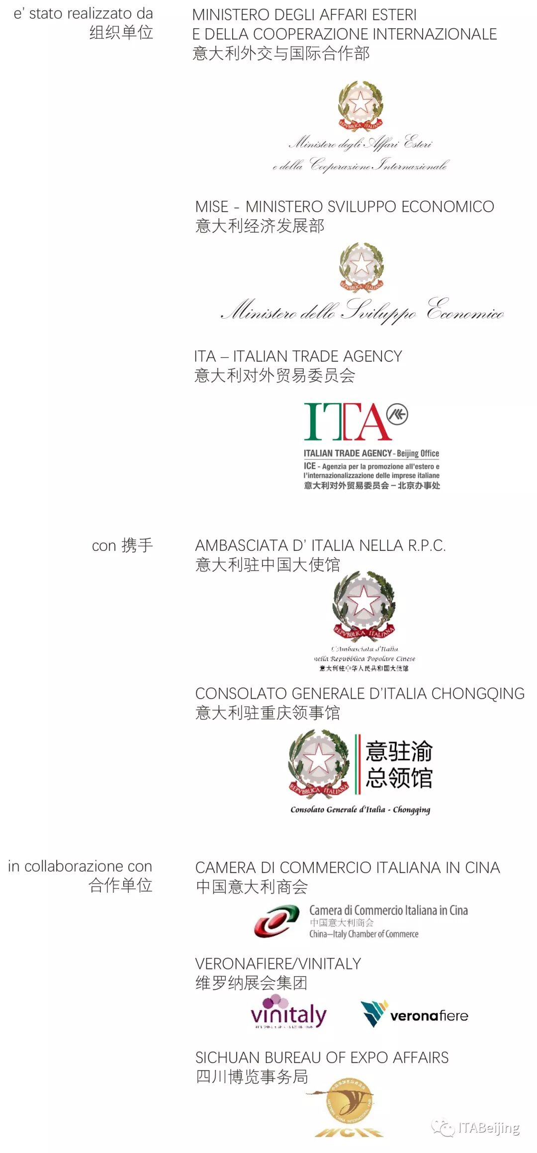 Italia Paese d’Ospite d’onore a Chengdu è un’iniziativa realizzata, con il Ministero degli Affari Esteri, dal MISE-Ministero dello Sviluppo Economico e ICE - ITA Agenzia,  l' Ambasciata d’Italia nella Repubblica Popolare Cinese, il Consolato Generale d’Italia a Chongqing ed in collaborazione con la Camera di Commercio Italiana in Cina e Veronafiere/Vinitaly.