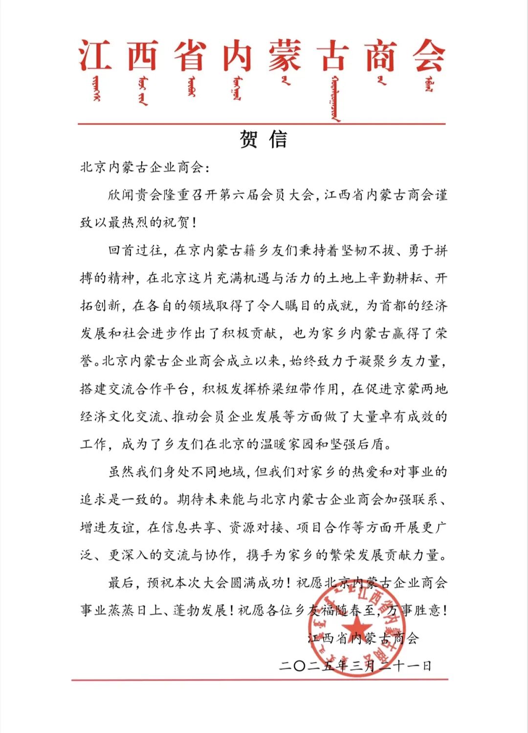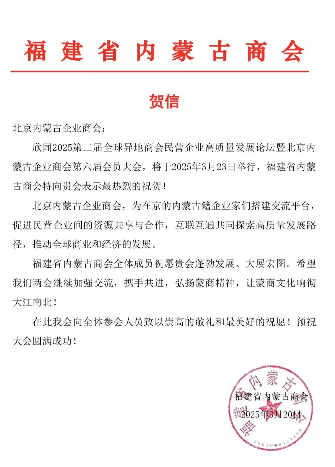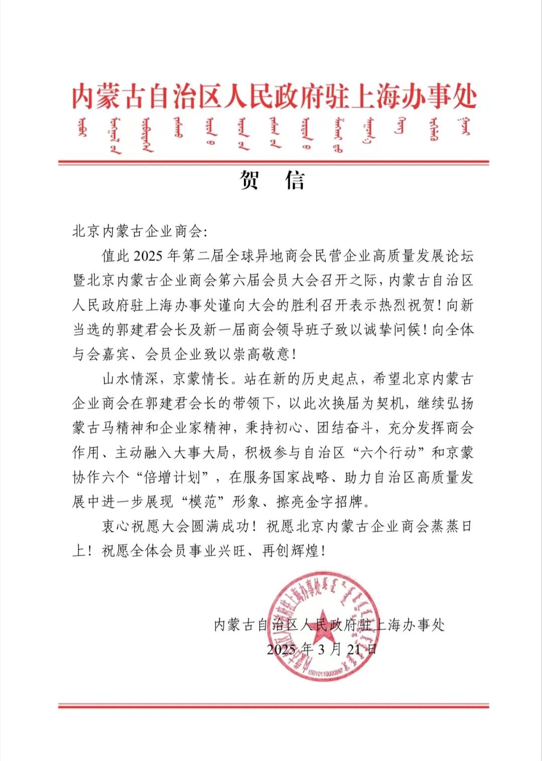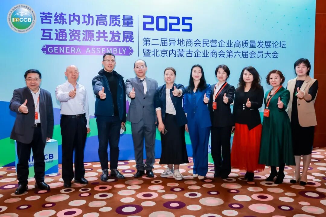 2025年3月23日,北京内蒙古企业商会主办的“2025第二届异地商会民营企业高质量发展大会”在北京召开。全国人大机关党委原副书记兼纪委书记李庆、全国政协原常委兼副秘书长何丕洁,新华社办公厅原副书记、纪委书记张海祥,甘肃省委原常委、宣传部部长、中国艺术研究院原院长连辑,北京市政协经济委员会正局级副主任李石柱、内蒙古自治区商务厅党组成员、副厅长康志国,内蒙古自治区人民政府驻北京办事处党组成员、副主任师建国,内蒙古文化和旅游厅副厅长孙国铭、国家知识产权局知识产权运用促进司副司长杨海燕、中华全国供销合作总社国际合作部部长丛山、内蒙古自治区人民政府驻上海办副主任张彦学等领导出席大会。北京内蒙古企业商会会长、君诚实业集团董事长郭建君,北京内蒙古企业商会执行会长、蒙牛集团执行总裁吴喜春,常务副会长聂振勇、王文华、王进平、王云厅,副会长李夺、王靖、陈彬、吕俊峰、牛保云、张志强、吉辉、李维、李欣、陈凯铭、韩放、张雷、祁树强、张岗、杨光、张继萍,监事长刘罡明、秘书长于强、执行秘书长杜志琴等北京内蒙古企业商会的会员们,来自北京、内蒙古两地各区/盟市的工商联、投促局、各盟市驻京联络处负责人,世界各地、全国各地内蒙古商会、北京各异地商会、校友会等70家商会代表,及社会各界人士近500人出席了大会。