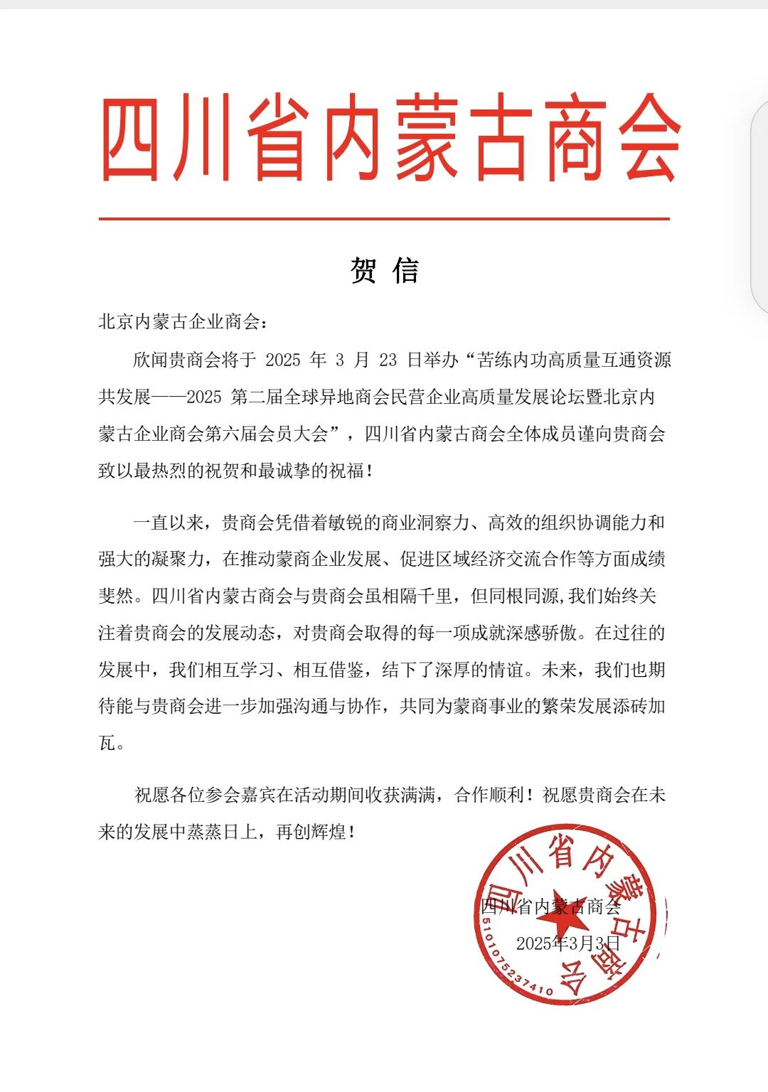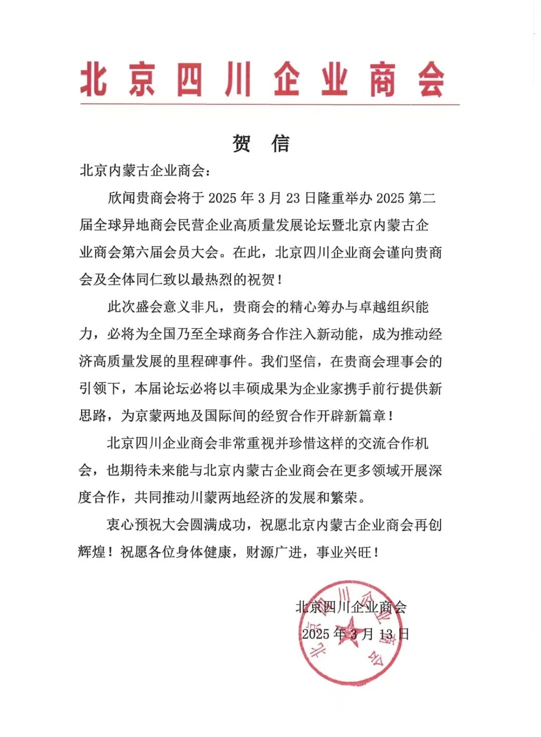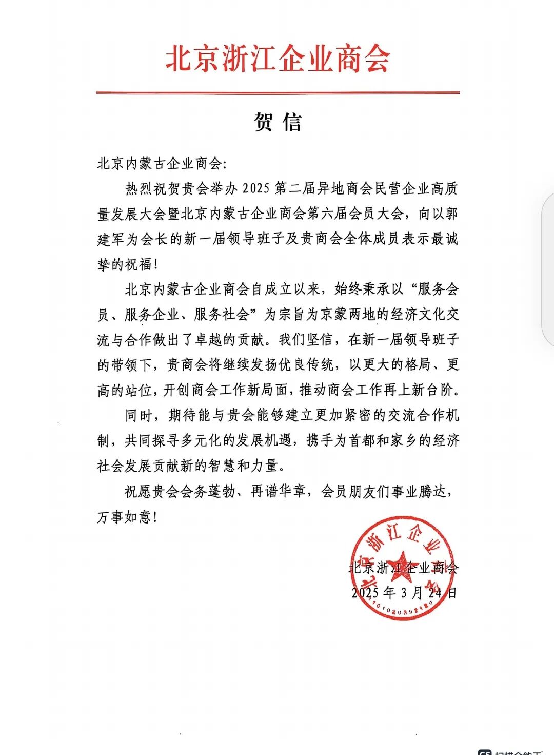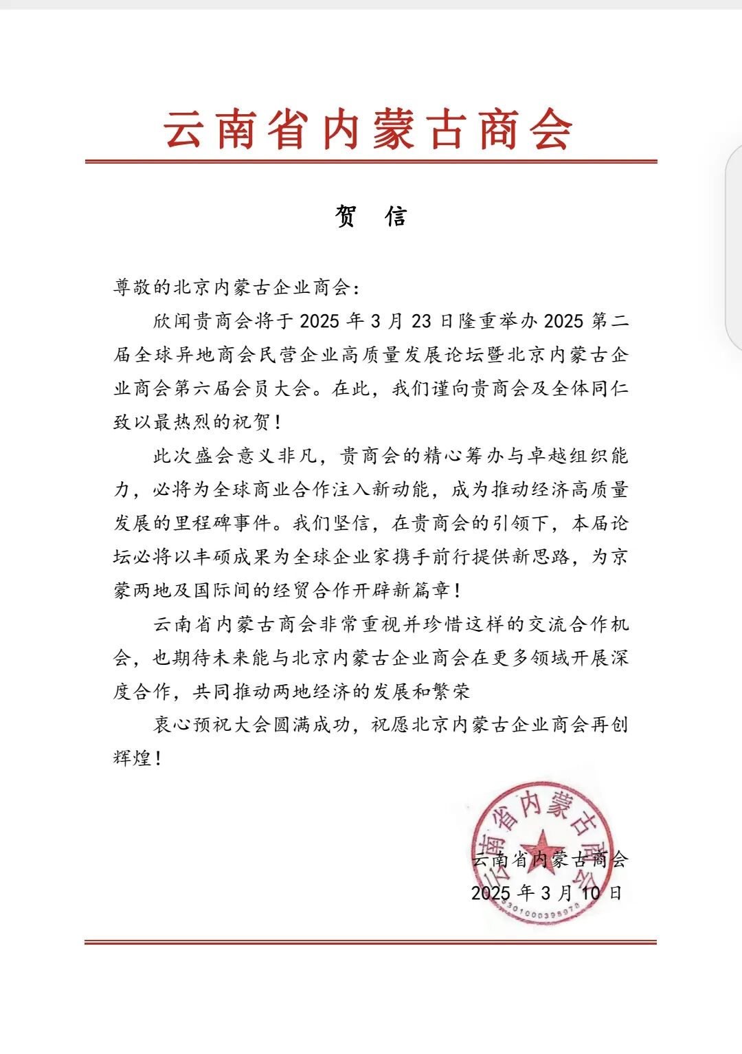 2025年3月23日,北京内蒙古企业商会主办的“2025第二届异地商会民营企业高质量发展大会”在北京召开。全国人大机关党委原副书记兼纪委书记李庆、全国政协原常委兼副秘书长何丕洁,新华社办公厅原副书记、纪委书记张海祥,甘肃省委原常委、宣传部部长、中国艺术研究院原院长连辑,北京市政协经济委员会正局级副主任李石柱、内蒙古自治区商务厅党组成员、副厅长康志国,内蒙古自治区人民政府驻北京办事处党组成员、副主任师建国,内蒙古文化和旅游厅副厅长孙国铭、国家知识产权局知识产权运用促进司副司长杨海燕、中华全国供销合作总社国际合作部部长丛山、内蒙古自治区人民政府驻上海办副主任张彦学等领导出席大会。北京内蒙古企业商会会长、君诚实业集团董事长郭建君,北京内蒙古企业商会执行会长、蒙牛集团执行总裁吴喜春,常务副会长聂振勇、王文华、王进平、王云厅,副会长李夺、王靖、陈彬、吕俊峰、牛保云、张志强、吉辉、李维、李欣、陈凯铭、韩放、张雷、祁树强、张岗、杨光、张继萍,监事长刘罡明、秘书长于强、执行秘书长杜志琴等北京内蒙古企业商会的会员们,来自北京、内蒙古两地各区/盟市的工商联、投促局、各盟市驻京联络处负责人,世界各地、全国各地内蒙古商会、北京各异地商会、校友会等70家商会代表,及社会各界人士近500人出席了大会。