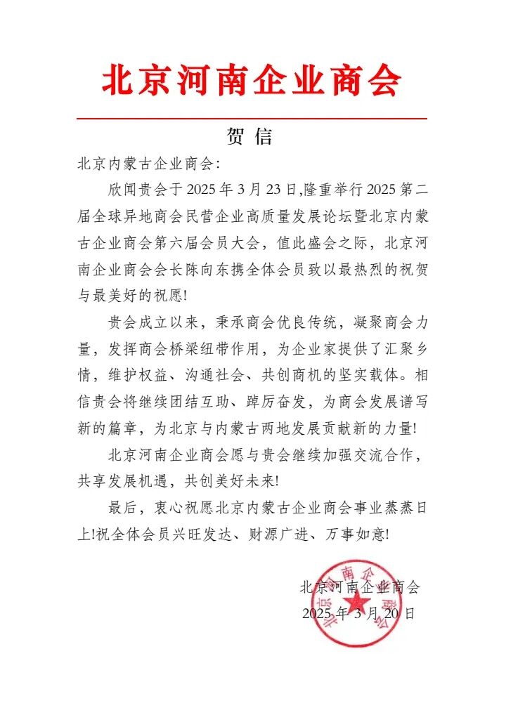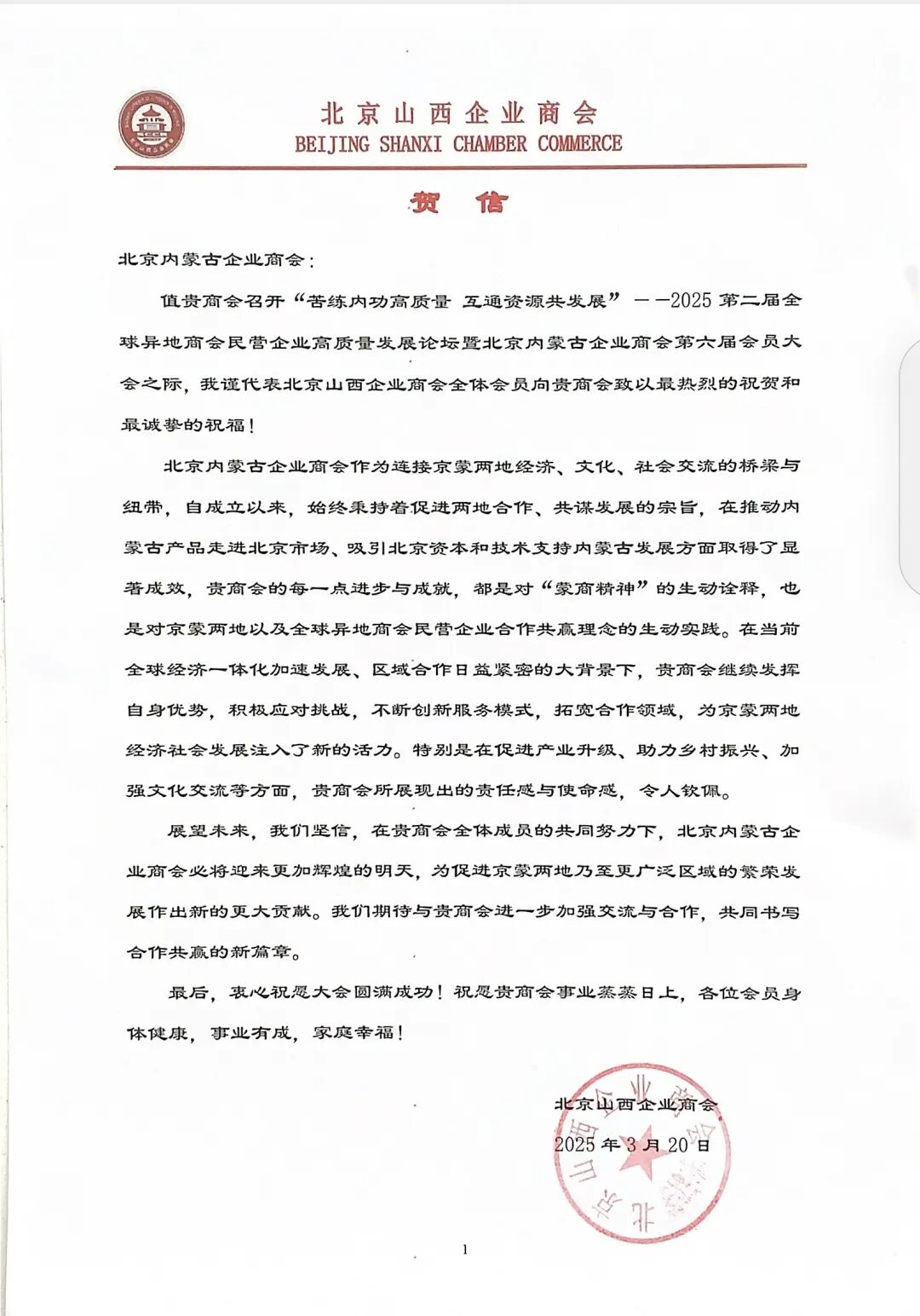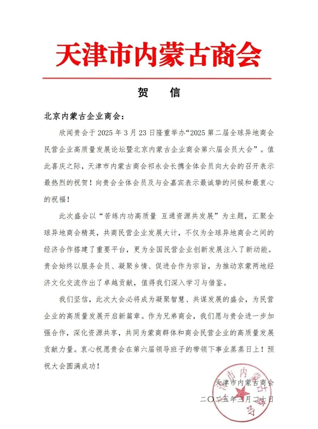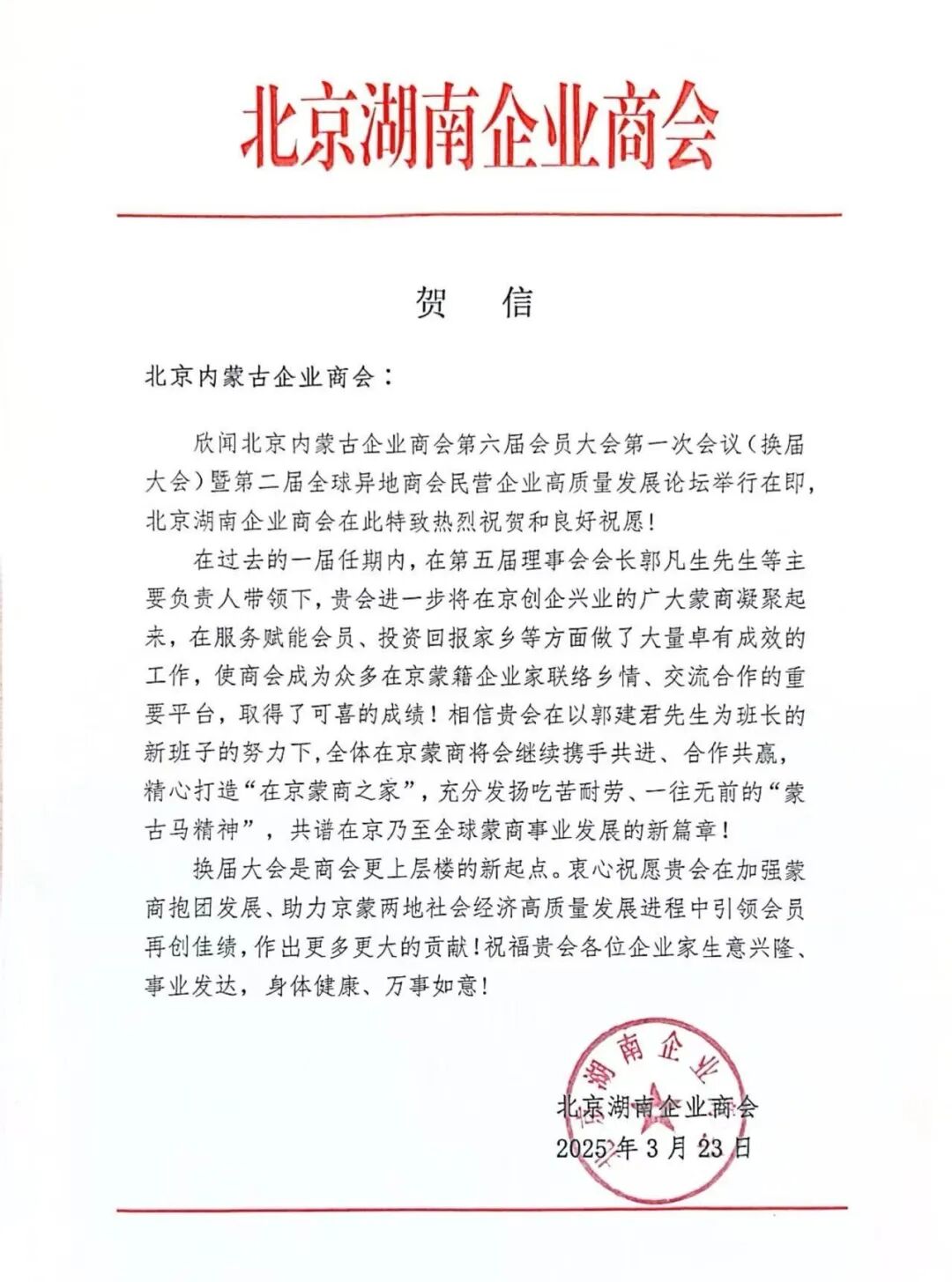 2025年3月23日,北京内蒙古企业商会主办的“2025第二届异地商会民营企业高质量发展大会”在北京召开。全国人大机关党委原副书记兼纪委书记李庆、全国政协原常委兼副秘书长何丕洁,新华社办公厅原副书记、纪委书记张海祥,甘肃省委原常委、宣传部部长、中国艺术研究院原院长连辑,北京市政协经济委员会正局级副主任李石柱、内蒙古自治区商务厅党组成员、副厅长康志国,内蒙古自治区人民政府驻北京办事处党组成员、副主任师建国,内蒙古文化和旅游厅副厅长孙国铭、国家知识产权局知识产权运用促进司副司长杨海燕、中华全国供销合作总社国际合作部部长丛山、内蒙古自治区人民政府驻上海办副主任张彦学等领导出席大会。北京内蒙古企业商会会长、君诚实业集团董事长郭建君,北京内蒙古企业商会执行会长、蒙牛集团执行总裁吴喜春,常务副会长聂振勇、王文华、王进平、王云厅,副会长李夺、王靖、陈彬、吕俊峰、牛保云、张志强、吉辉、李维、李欣、陈凯铭、韩放、张雷、祁树强、张岗、杨光、张继萍,监事长刘罡明、秘书长于强、执行秘书长杜志琴等北京内蒙古企业商会的会员们,来自北京、内蒙古两地各区/盟市的工商联、投促局、各盟市驻京联络处负责人,世界各地、全国各地内蒙古商会、北京各异地商会、校友会等70家商会代表,及社会各界人士近500人出席了大会。