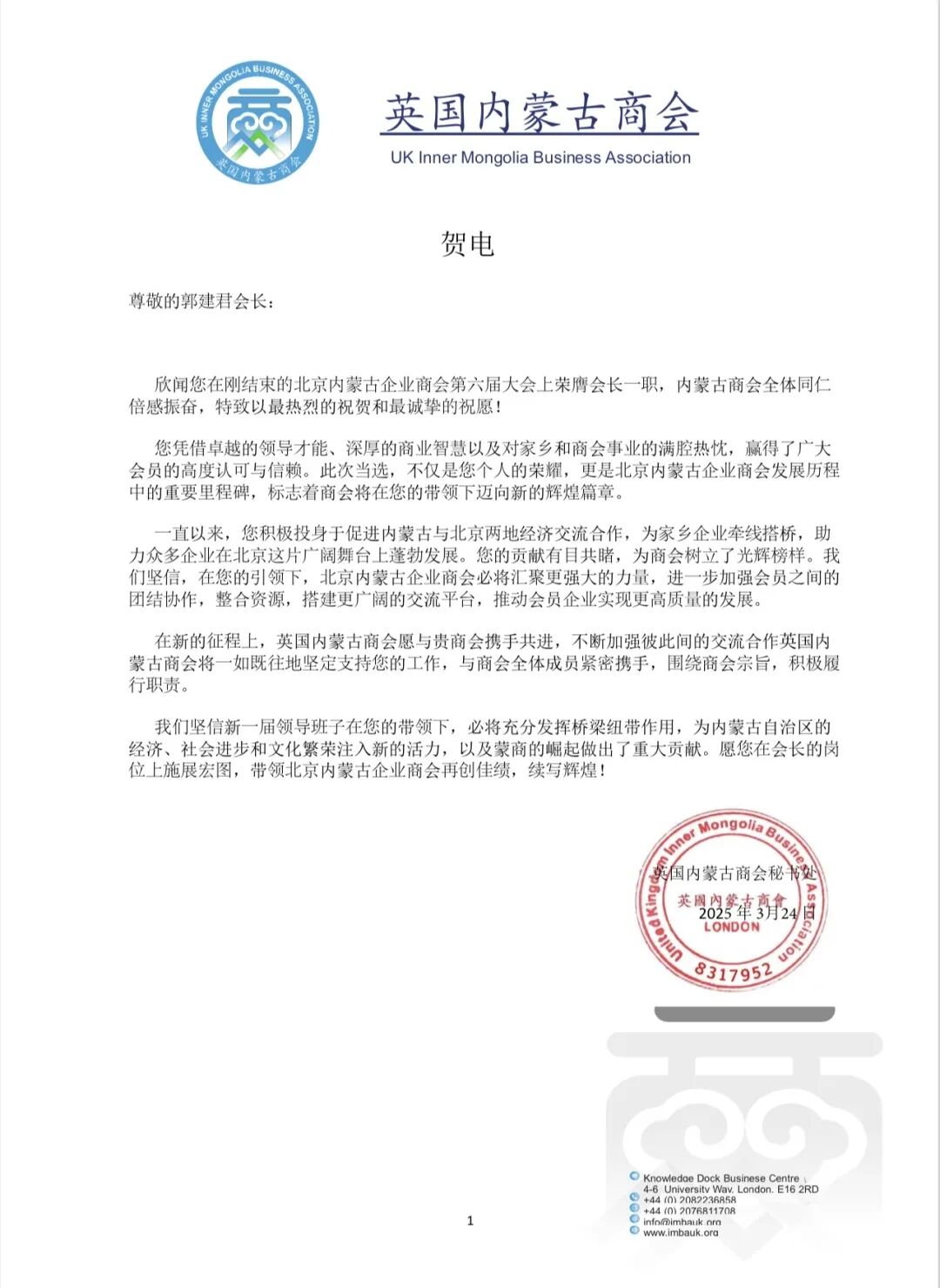 内蒙古自治区商务厅党组成员、副厅长康志国致词时讲到,内蒙古内联八省,外接俄蒙,区位优势突出,是我国向北开放的重要桥头堡,有20个对外开放口岸,边境陆路口岸货运量突破1.2亿吨,居全国首位。目前,与内蒙古有贸易往来的国家和地区多达187个。内蒙古自然景观瑰丽,矿产资源丰富,煤炭、稀土等21种资源储量全国第一,风能、太阳能资源开发潜力巨大。作为我国重要的现代能源基地,内蒙古煤炭保供量及外送量、总发电量及外送电量、新能源发电量等均居全国首位。“头上有风光,脚下有宝藏,手中有电网”,是我国重要的“粮仓”“肉库”“奶罐”“绒都”。内蒙古产业政策优厚,是唯一同时享受西部大开发、东北全面振兴、黄河流域生态保护和高质量发展三大国家区域协调发展政策的省份。2024年,内蒙古引进国内到位资金5573.1亿元,同比增长16.6%,提前一年圆满完成“三年引进1万亿元到位资金”目标。京津冀地区产业基础雄厚、科技资源丰富、终端市场活跃,与内蒙古的现代化产业体系有高度的互补性。京津冀地区一直都是内蒙古重要的投资来源地和目标招商地,真诚欢迎京津冀企业到内蒙古投资发展,共享产业红利。感谢北京内蒙古企业商会主办的异地商会交流大会这个大平台,我们期望借助北京内蒙古企业商会等异地商会的丰富资源和独特优势,大力推动北京和内蒙古企业在技术、资本、市场等层面展开深度合作,充分发挥商会“以商招商”的独特优势,积极引进延链补链强链项目,促进更多优质项目落地内蒙古。我们也诚邀北京内蒙古企业商会等各异地商会的企业家朋友们积极投身内蒙古的各项事业,积极参与内蒙古的现代化产业体系建设,不断提升内蒙古在全国乃至全球产业链、供应链、价值链中的地位和影响力!