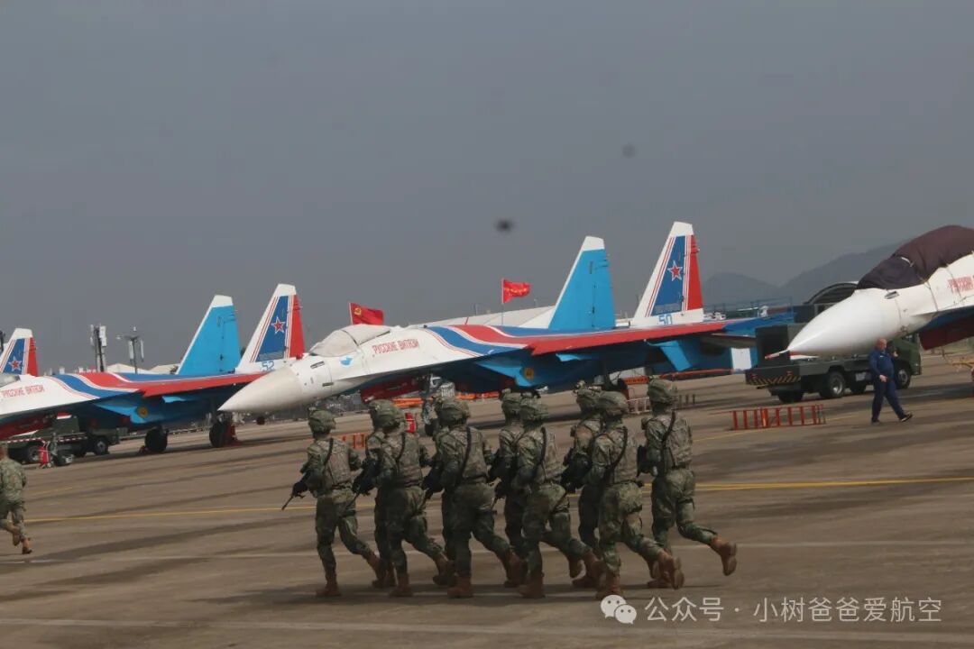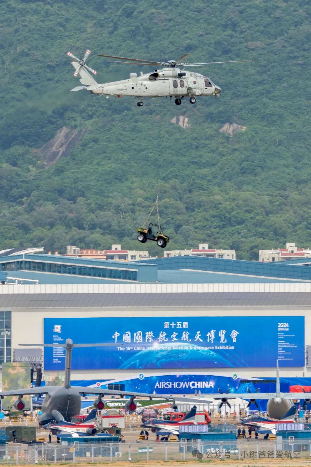 海军来了直-20,而且执行了两种任务。一种两侧带挂架,每个挂架携带4枚空地导弹,可能是反坦克导弹,合计8枚。这是直20的武装型第一次公开展示。另外一种不带挂架,下面挂载猫猫车进场。海军的直升机编队有5架直8,3架直20。8架直升机每天一起飞入场内,从直8上下来海军陆战队的战士,拿着枪,在外场列队行进,杀气腾腾,巍巍壮观。