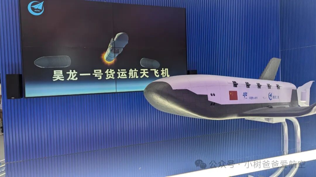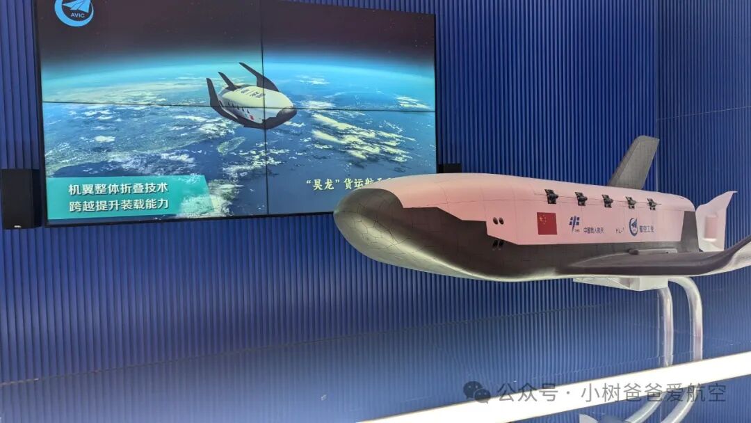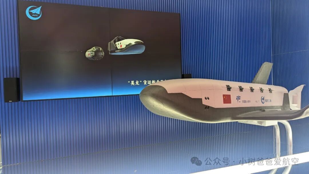 这次的亮点之一,是这个昊龙货运无人航天飞机。它是通过火箭发射的,机翼可折叠。演示动画中还是一个两级的运载火箭,把它送入轨。我在视频中发现它是尾部对接空间站的节点舱,就很疑惑,尾部一般不都是发动机吗?这次看了现场模型,发现昊龙没有主发动机,尾部就是个货舱门,直接对接空间站。其头部和尾部有多个姿态调整发动机,非常的小,仅能微调姿态,无法提供前进的动力。相当于昊龙完全是靠火箭送入轨道,然后自己滑翔返回,用起落架在机场水平着陆。这和美国之前搞的航天飞机确有相似之处,只是体积小了很多,成本也低很多。现在我国的天舟货运飞船,只能把货物上行,送到空间站,它返回重入大气层时就烧毁了,是一次性使用的。神州飞船能把航天员送上空间站和带回地面,但不能运货,也是一次性的。昊龙航天飞机很好的解决了空间站货物下行的问题,也可重复使用,是中航工业成都所的创新产品。