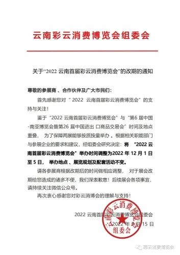 “第6届中国―南亚博览会暨第26届中国昆明进出口商品交易会”将于2022年10月31日-11月3日在滇池国际会展中心举办,为保障两展能够按质按量顺利举行,经组委会研究决定,将“2022云南首届彩云消费博览会”的举办时间调整为2022年12月1日至5日,举办地点、展览规划及配套活动不变。