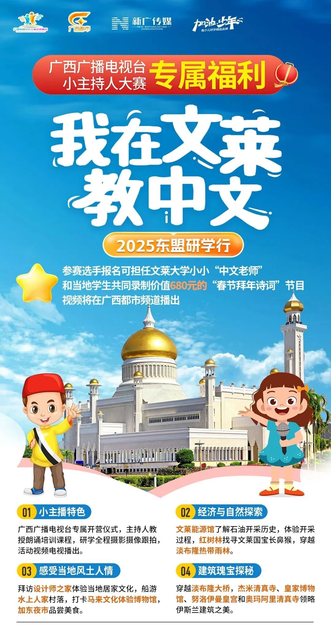 孩子们将在文莱大学担任“小小中文老师”,与文莱学生用中文互动。广西广播电视台小主持人大赛参赛选手,报名参加“我在文莱教中文”2025东盟研学行即可获得专属福利——和当地学生共同录制价值680元的春节拜年诗词”节目,视频将在广西都市频道播出。通过朗诵诗词传递祝福与美好,记录个人成长和跨文化交流的珍贵时刻。