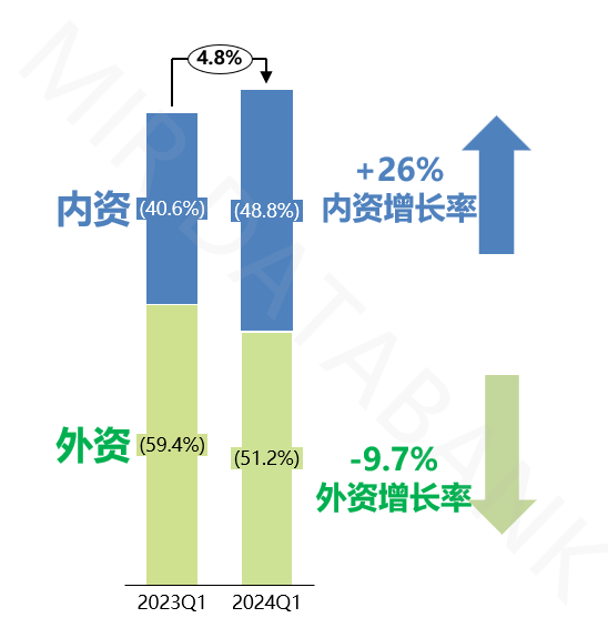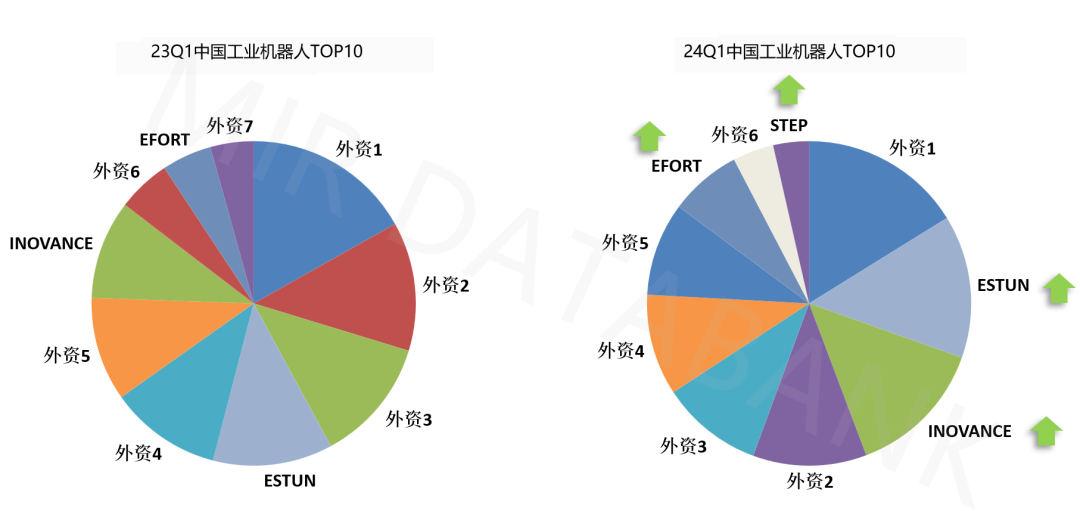 24年Q1,国产工业机器人头部厂商持续在电子、汽车部件、金属制品等行业和外资不断争锋并抢占市场份额,内资市场份额提高了8%,达到48.8%。