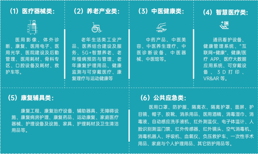 养老产业类:老年生活类工业产品、医养结合建设及服务、5G+智慧养老、老年慢病预防与管理、老年康复护理用品、健康监测与可穿戴医疗、康复理疗与运动健康等;