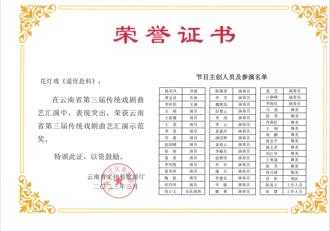 3月,参加第三届云南省传统戏剧曲艺汇演,滇剧《杨门女将之校场比武》获传承奖,花灯戏《逼侄赴科》获示范奖。