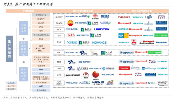 随着数字经济、人工智能和工业4.0的深度融合,“数字经济+工业”潜在发展空间广阔。生产控制类工业软件是对工业设备及控制系统进行管理控制、数据采集、生产执行与安全告警的一类软件。生产控制环节位居企业经营管理关键位置,与设计、经营、财务等环节联系密切。生产控制类工业软件主要涵盖过程控制、先进过程控制及优化、生产执行及管理三大类,国产化布局相对充分。1、过程控制类: DCS、SIS、SCDA、PLC(1)DCS(集散控制系统)是以微处理器为基础,采用分散控制、集中显示、分而自治、综合协调的设计原则的新一代仪表控制系统。DCS 由输入输出模块、通信模块、控制器和人机界面组成,用于实现对生产过程的数据采集、控制和监视功能。据智研咨询,2022 年我国 DCS 市场规模或达 119.2亿元,同比增长7.2%。2021年我国 DCS 国产化率达55.7%,2016 年以来逐年提升,国产替代空间可观。中控技术国内 DCS 市场份额33.8%,国内市场市占率首位。(2)SIS:异常工况仪表控制系统,国内 28 亿元规模市场集中度较高;2019年康吉森与中控合计约占国内市场的 50%,两家公司在 2019~2021 年始终位居国内市占率前两位。(3)SCADA(数据采集与监视控制系统)是以计算机为基础的生产过程控制与调度自动化系统,可以对现场的运行设备进行监视和控制。据华经产业研究院,SCADA 国内市场规模接近 156 亿元,下游行业以电力、市政、石油天然气为主。(4)PLC:可编程逻辑控制器,国内 PLC 市场整体由海外龙头主导PLC 由继电器发展而来,主要用于存储执行逻辑运算、顺序控制、定时、计数和算术运算等操作的指令,并通过数字式或模拟式的输入输出来控制各种类型的机械设备或生产过程。按照输入/输出(I/O)点数的多少,可将 PLC 分为小型、中型、大型三类。点数越多,控制规模越大,要求的程序存储器容量越大,指令与功能越丰富,能够应用于更为复杂的控制任务,技术要求也同步抬高。据亿渡数据《2022 年中国 PLC 行业研究报告》,2022 年我国 PLC 市场规模或达 160.9 亿元,同比增长 4.8%。APC(先进过程控制)协助自动化控制系统处理复杂生产过程控制,以实现常规控制无法有效处理的复杂过程的平稳性改善和卡边优化功能的系统。APC 包括 RTO(实时优化)、MPC(模型预测控制)、ERC(增强控制)三大组成部分。中控技术为 APC 赛道龙头,连续三年位居国内 APC 市占率第一,市场规模大致在亿元量级。(1)MES(制造执行系统)是从生产计划下达到生产调度、组织、执行、控制,直至生产出合格产品全过程的信息化管理系统。据华经产业研究院,2022 年全球 MES 市场规模或达 1,420 亿元,同比增长 15.2%。2017~2022 年 CAGR 达 15.5%,2024 年市场规模或达 1898.6 亿元。2022 年我国 MES 市场规模或达 57.2亿元,2020~2022 年CAGR达13%。(2)LIMS:实验室信息管理系统,应用于科研机构及研发部门(3)OTS:仿真培训系统;国内主要厂商包括中控技术、康吉森等。中控技术系国内流程工业自动化控制领军企业,主要产品为工业控制系统、仪器仪表以及生产管理类工业软件。其中核心产品 DCS 系统市占率长期位居国内首位,2021 年市占率达 34%。赛意信息深耕泛 ERP+智能制造 MOM 领域多年,脱胎于美的 IT 部门,现已形成以泛 ERP 和智能制造为主的整体布局,为企业提供高端软件咨询、实施及集成服务。能科科技系智能制造与智能电气先进技术提供商。公司专注于为离散制造业提供智能研发、智能生产到智能服务的全生命周期集成服务,销售计划、生产管理到自动化产线的企业纵向集成服务。汉得信息系国内市场上颇具规模的数字化综合服务商,具备全面的企业数字化服务能力。鼎捷软件系国内智能制造小巨人,“智能+”布局助力产业数字化升级。公司围绕 ERP&ERPII、智能制造解决方案以及云与工业互联网应用三个产品矩阵打造自身产品方案架构。在“智能+”整体战略布局下,确立“一线三环互联”战略路径。宝信软件系国内智能制造领军,多行业覆盖能力出众。公司业务涉及应用到服务,流程设计到智能装备,交通行业到智慧城市,已基本形成多维立体的工业软件方案化交付能力。公司业务范围覆盖钢铁、交通、医药、有色、化工、装备制造、金融等多个行业,近五年营收 CAGR 达 24.3%。柏楚电子系国内中低功率激光切割控制系统龙头。公司中低功率业务国内市占率多年维持在 60%以上;在高功率领域系唯一打破国外垄断的国产厂商。容知日新系国内设备智能运维领军企业,公司发轫于工业设备状态检测与智能诊断系统市场,深耕设备智能运维领域。金橙子系国内振镜控制系统龙头。公司核心产品为激光加工控制系统,2020 年市场占有率达 32.3%,位居国内首位。公司业务以振镜控制系统为主,主要应用于激光标刻、激光切割、激光焊接及其他微加工领域,主要适用于低功率激光器对应的多种微加工。国金证券《生产控制类之一:乘智能制造东风,渡自主可控长河》【风险提示】本文内容来自券商研报、Go-Goal金融终端及公开市场信息,文中观点及数据均不构成任何投资建议。