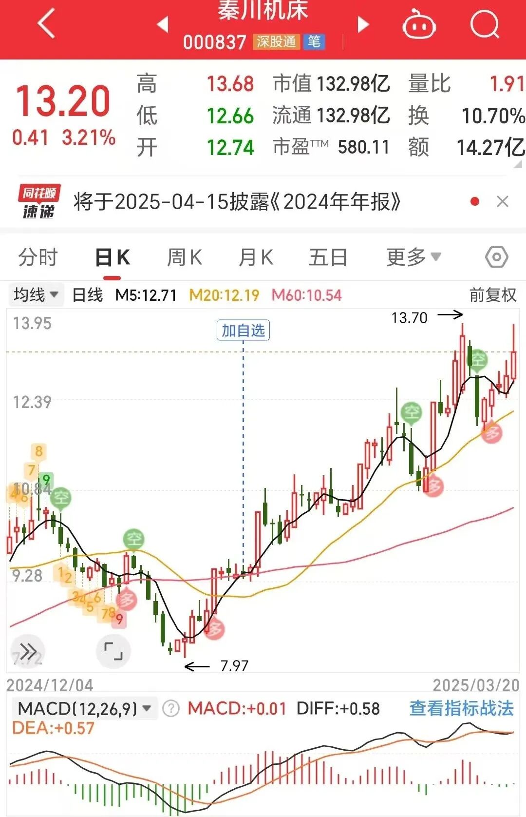 筹码分布:10-12元区间筹码占比55%,13元以上套牢盘占30%,主力需消化浮筹; 资金行为:3月17日游资大幅介入后回调,近期缩量企稳,疑似洗盘吸筹; 板块联动:机器人板块热度升温,但秦川机床尚未突破前高,存在补涨预期。