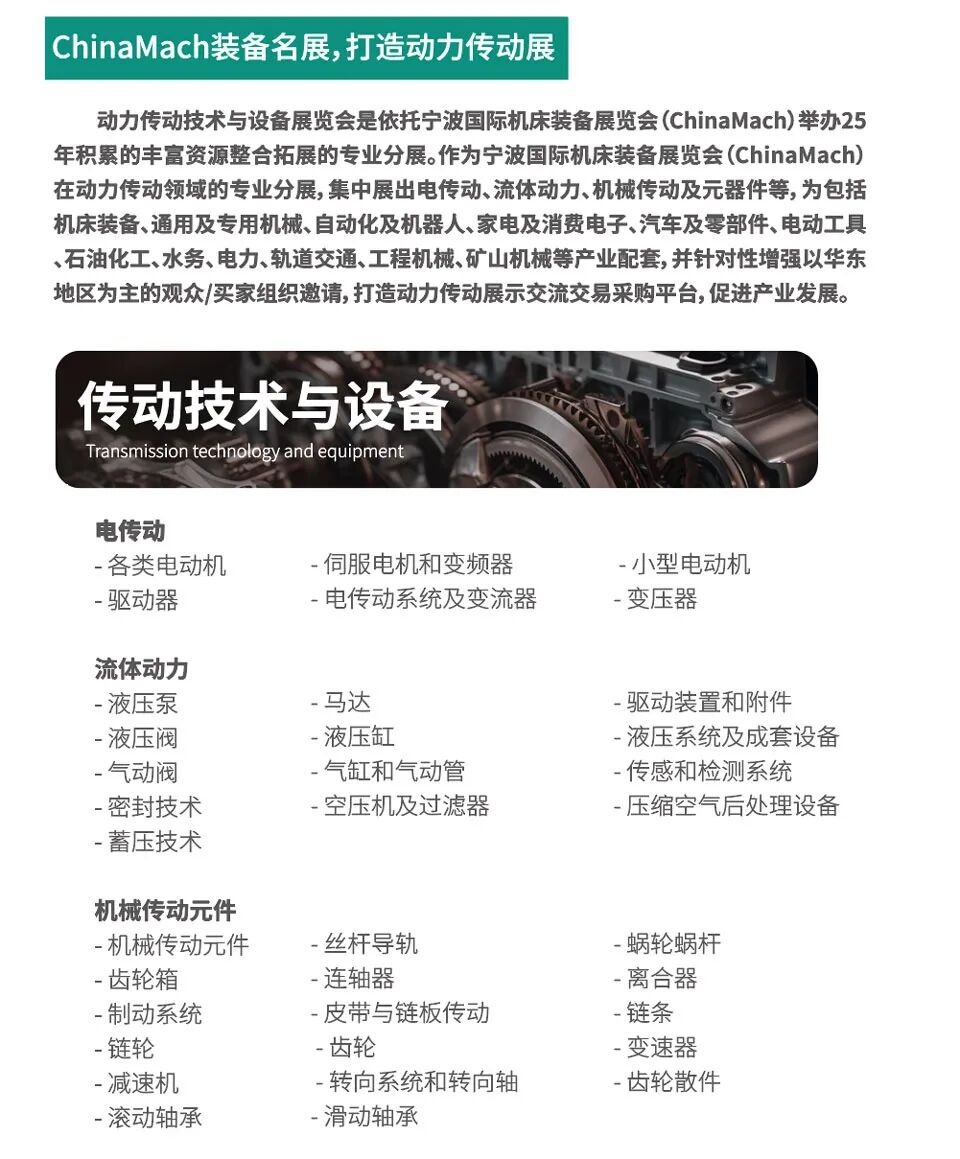 ChinaMach宁波国际机床装备展览会(下文简称:宁波机床展)是商务部和宁波市人民政府认可和支持、UFI认证的展会,2025年展会定档于2025年3月12日-15日,在宁波国际会展中心举办。本次展会面积近40000平方米,1800个展位,分机床装备/模具技术设备、激光/钣金、制造业工厂设备/智能制造/自动化/机器人应用、动力传动技术与设备四大板块,同期举办2025宁波动力传动技术与设备展览会。
