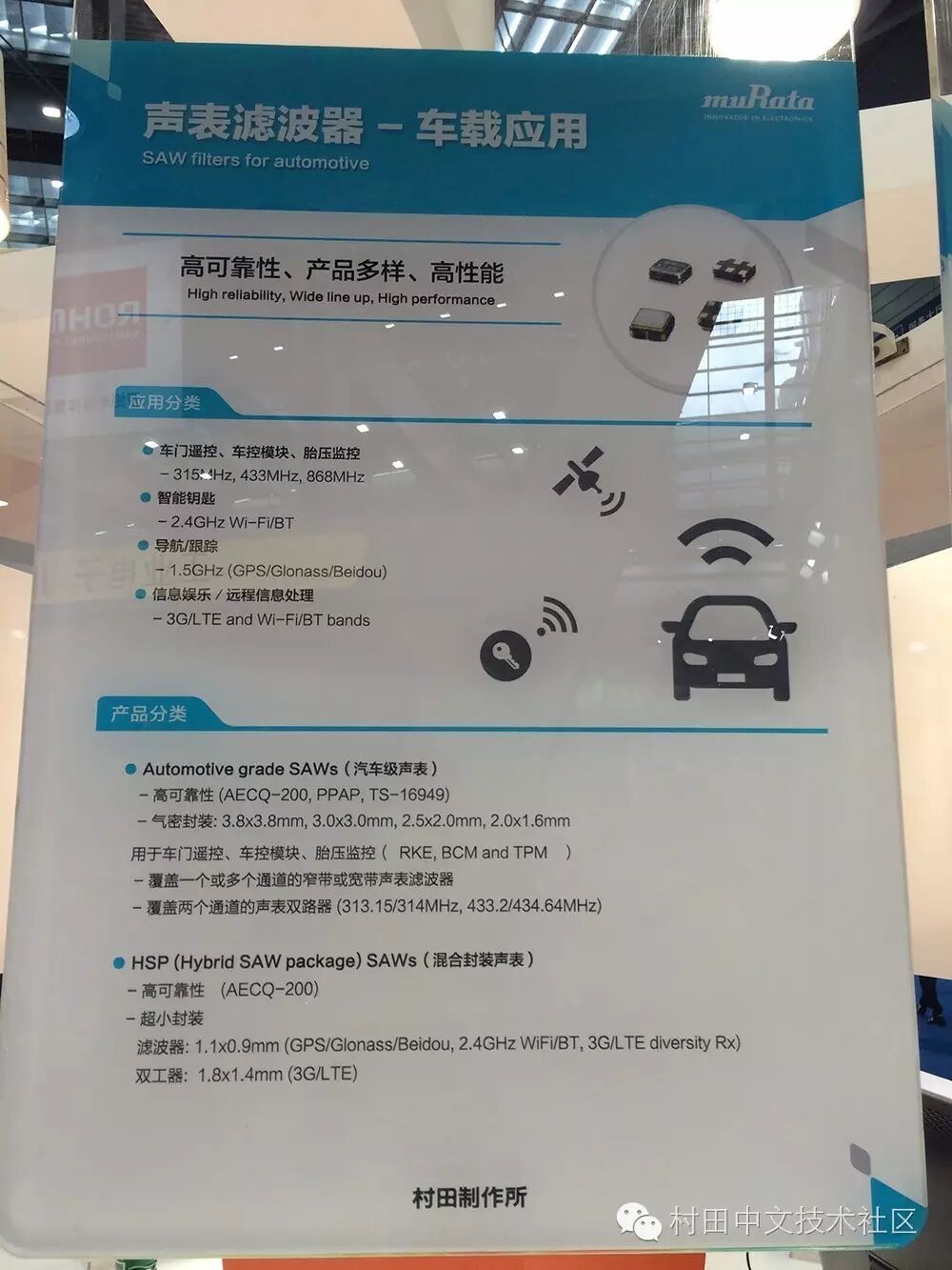 2016深圳国际电子展于今天在深圳会展中心隆重开幕,村田携IoT、汽车电子、智慧医疗、智能工业等领域的尖端产品和智能解决方案参加了本次展会。让我们一起来看看村田在汽车电子应用的产品图文报道: