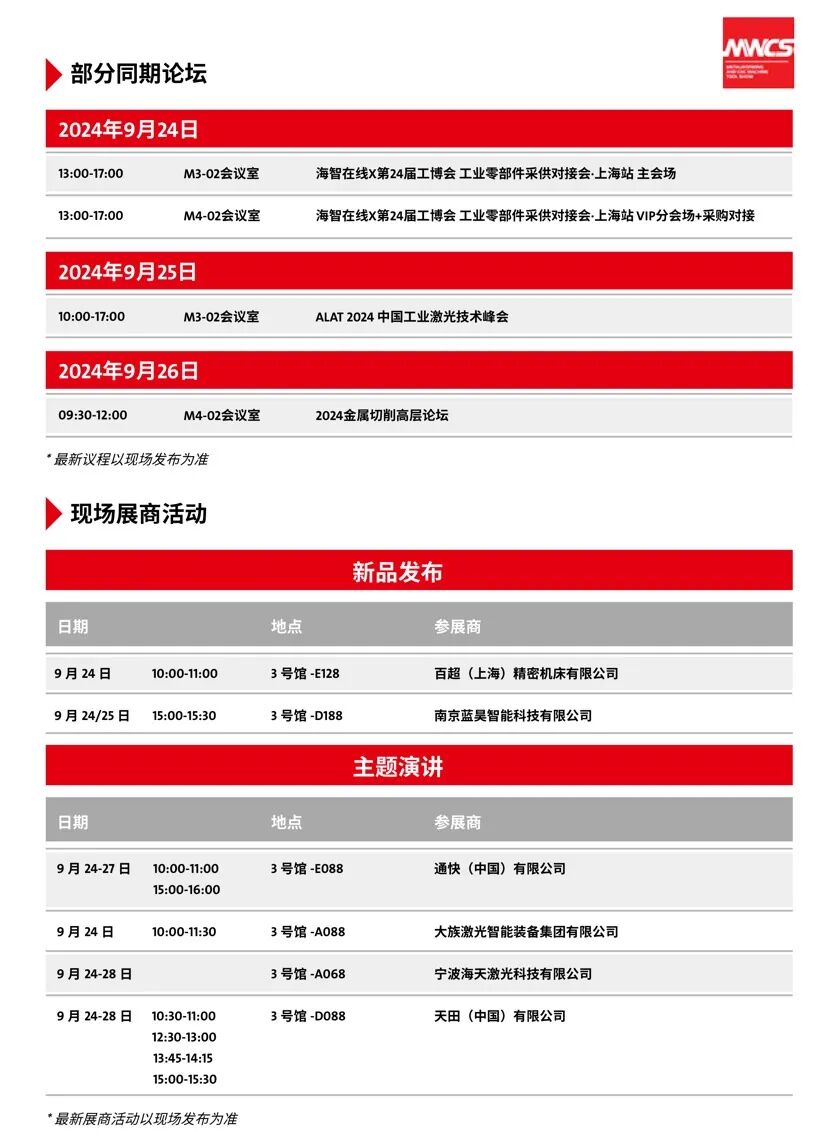 展会期间,工业自动化展和数控机床与金属加工展将现场配套举办近20场专题会议,包括:2024智汇上海·创新引领——数字化解决方案论坛、数字驱动·绿色赋能,共筑新型工业化未来、APS Asia亚洲动力总成产业技术大会、智能工业、低碳制造--机器人&工业数字化与零碳工厂实践交流会、第二十一届 MES(制造执行系统)开发与应用专题研讨会---工业数字化转型和智能制造、上海市自动化学会学术年会---工业互联网与工业智能、新质生产力赋能制造业数字化转型研讨会、支持智能制造的PLCopen技术研讨会、ALAT 2024 中国工业激光技术峰会、2024金属切削高层论坛、海智在线X第24届工博会工业零部件采供对接会·上海站等。国际专家、两院院士、企业创始人、学术机构负责人等“政、产、学、研、媒、用、资”代表齐聚一堂,共话行业未来发展趋势,为企业把握市场先机提供智力支持,助力我国新型工业发展。