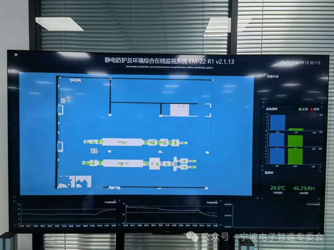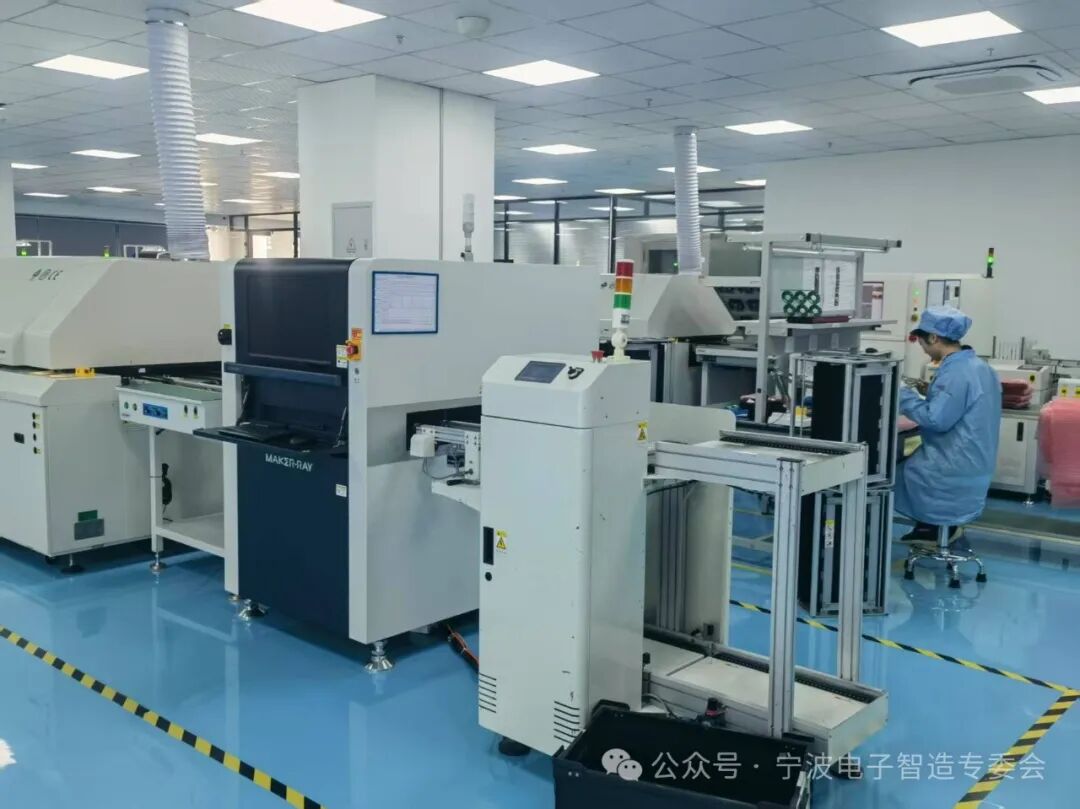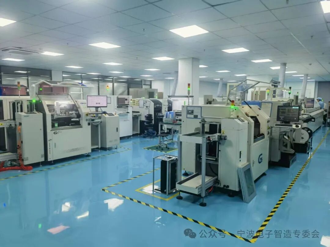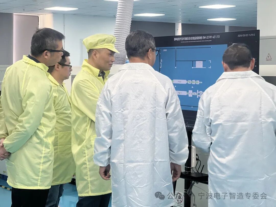宁工电子SMT车间内,地面光洁如镜,设备排列整齐,员工作业有序。车间已经安装了静电防护及环境综合在线监视系统,MES及智能仓也在计划实施中,总体面积不大但处处体现出高效及专业。各位老总对车间的整洁程度和管理水平给予了高度评价。
