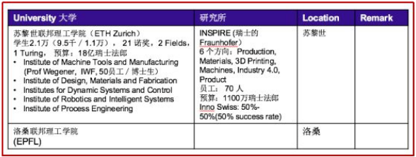 瑞士与制造相关的技术创新中心有EMPA和INSPIRE,后者坐落在苏黎世的瑞士联邦理工(ETH)旁。INSPIRE共有员工70多人,每年运行经费1100万瑞士法郎,所涉及六个研究方向包括材料、制造工艺、3D打印、机床设计、工业4.0和产品测试与评估。与之匹配的大学研究所有六家:机床与制造研究所(50多研究人员)、设计、材料与制造研究所、动力系统与控制研究所、机器人与智能制造研究所、制造流程研究所。INSPIRE和ETH在磨削领域的研究有很好的行业口碑,著名的联合磨削技术公司United Grinding Technology的多家子公司,如STUDER是其重要的企业合作伙伴。瑞士的核心零部件企业(传动部件领域的Schneeberger、伺服/直驱电机领域的Etel和Maxon等,主轴领域的Fisher,Step-tec和IBAG等,数控系统领域的NUM等)、主机厂(Mikron、GF、United Grinding、Willemin-Macodel、Fehlmann、Tornos、Studer、Starreg等),和瑞士高端制造领域(钟表、医疗器械、精密零部件等)的优质企业构成了瑞士机床产业生态的铁三角。政府通过双元制模式的职业教育,应用科技大学和研究型大学三重体系来培养产业所需的各类人才,通过设立匹配的大学研究所和产业研究所(INSPIRE和EMPA)把大学的原创技术一步一步推向产业一线,再通过设立InnoSwiss(申请和管理过程相对简单,成功率高达 50% 左右)类似的产业资助项目来完成技术产业化的最后一公里。
