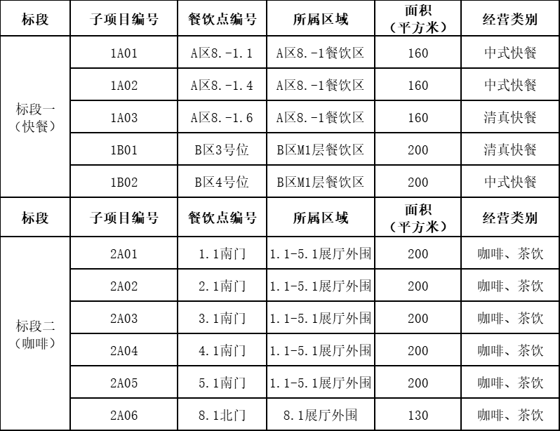 本项目为招商人位于广州市海珠区阅江中路380号广交会展馆A区以及阅江中路382号广交会展馆B区的11个餐饮点对外招商,设置两个标段,标段一:快餐点服务单位遴选,共有快餐点5个,每个快餐点设为1个子项目,即标段一共设5个子项目;标段二:咖啡点服务单位遴选,共有咖啡点6个,即标段二共设6个子项目。标段和子项目可兼投,每个标段仅能中选一个子项目。具体如下:
