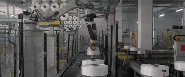 走进桐昆集团恒邦二期工厂的纺丝车间,迎面而来的是和传统纺织车间迥然不同的景象,巨大的立方体形状的生产机器纵向一列列整齐排开,宽阔的过道内只能看到零星的工人和智能机器人在忙碌。工业噪音混杂成巨响,让人需要靠得很近才能讲话。高耸、整齐的机器体现的机械之“力”和智能机器人、少人车间体现的“智”,混合成一种撼人心魄的新型工业奇观。一根根白亮的涤纶长丝像是瀑布一样自上而下流下,被缠在卷轴上,经过包装机器人打包、封装,然后被装车,被运往全国各地,乃至漂洋过海到达美国、非洲。