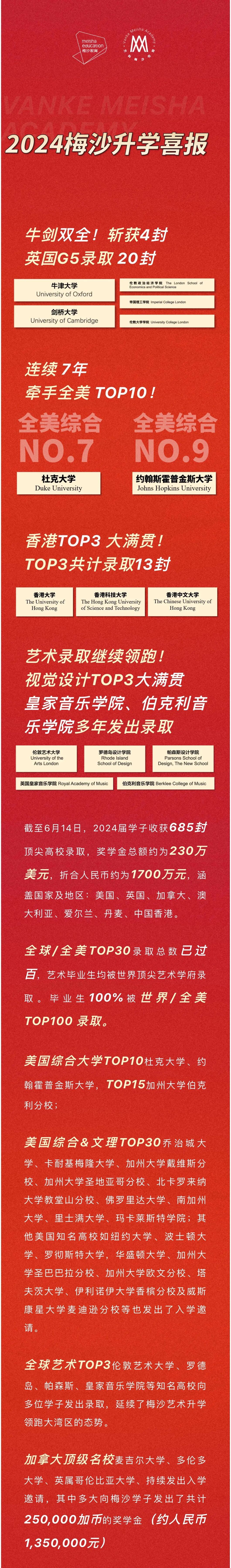 ✅ 升学成绩:截至6月14日,2024届梅沙学子收获685封顶尖高校录取,奖学金总额约为230万美元,折合人民币约为1700万元。