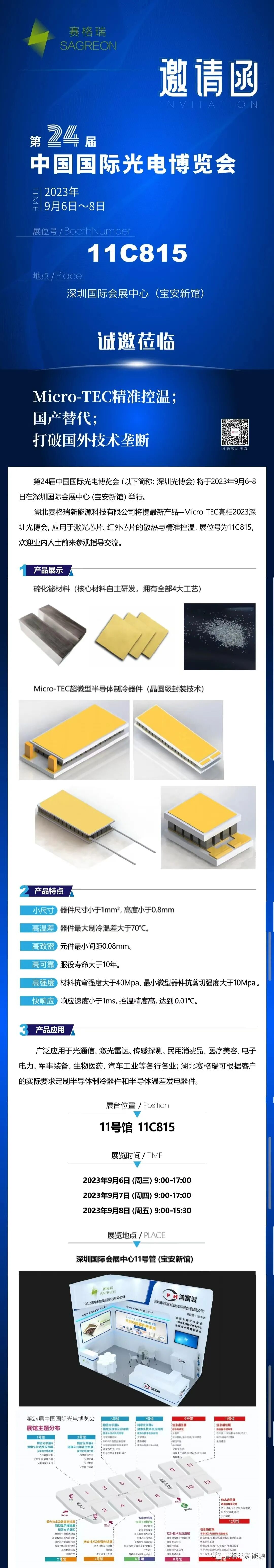 湖北赛格瑞新能源科技有限公司将携最新产品Micro-TEC亮相2023年9月6~8号的中国国际光电博览会,应用于激光芯片、红外芯片的散热与精准控温,展位号:11C815,欢迎业内朋友前来参观指导交流